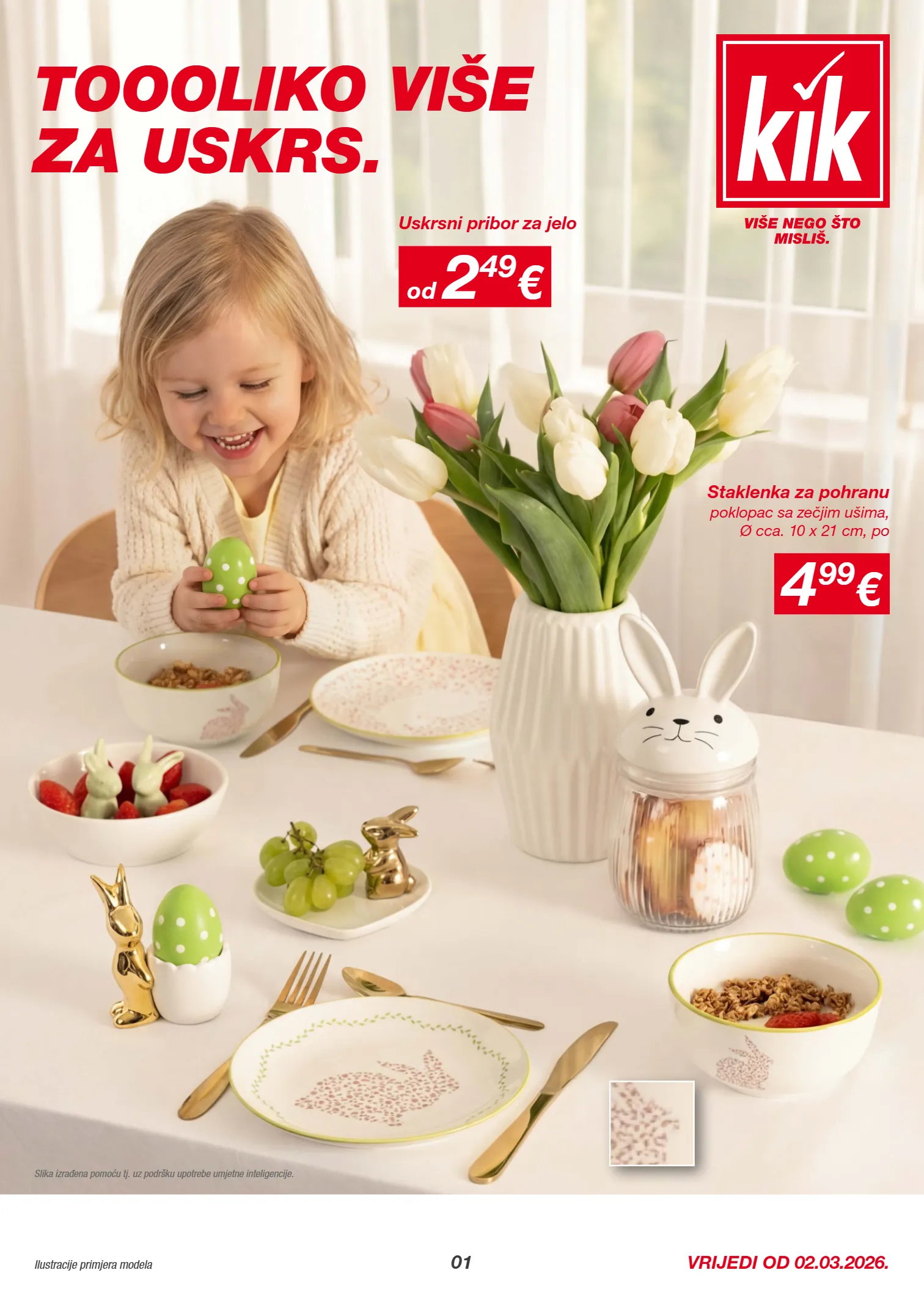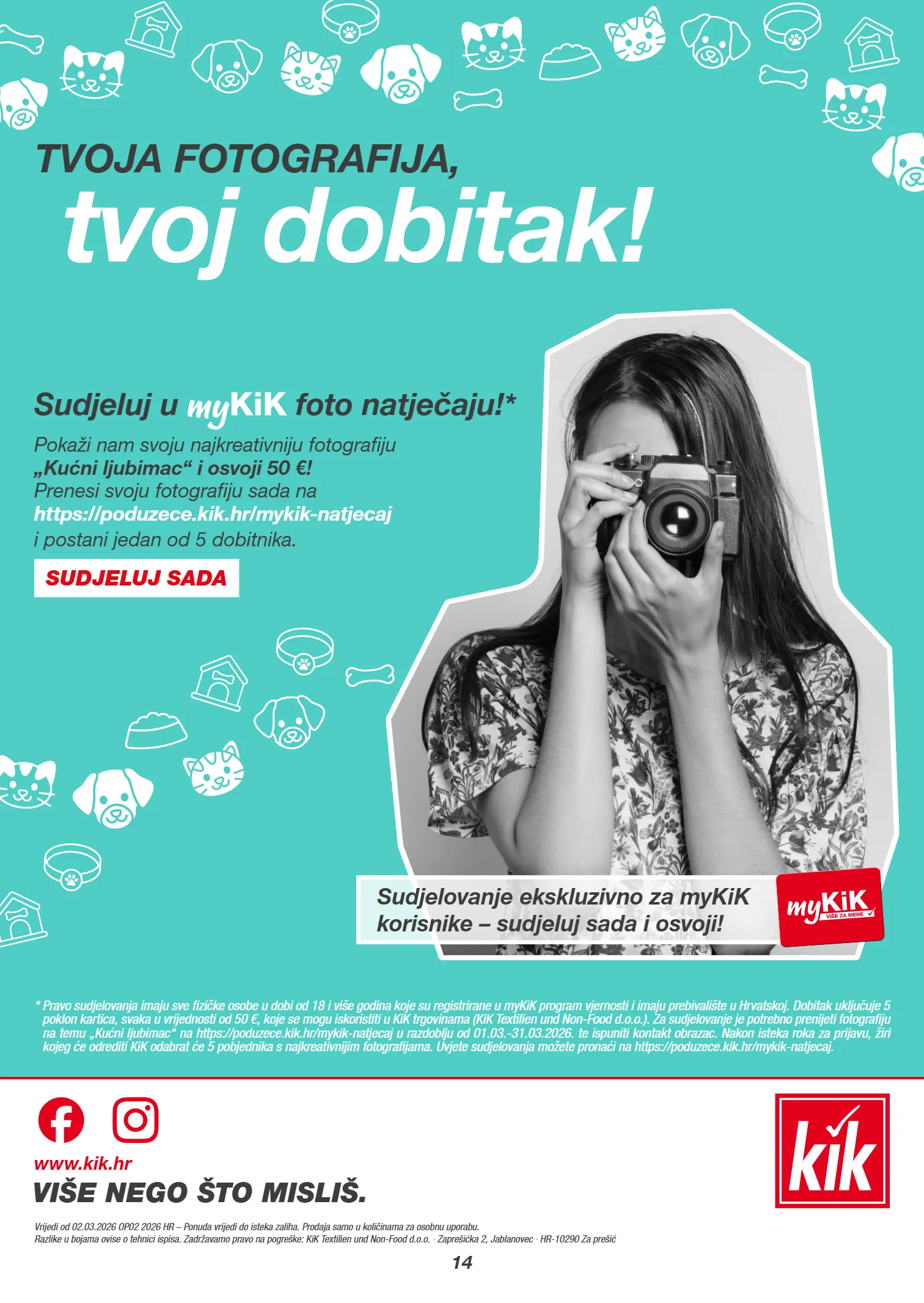 VIŠE NEGO ŠTO MISLIŠ. www.kik.hr Vrijedi od 02.03.2026 OP02 2026 H R – Ponuda vrijedi do isteka zaliha. Prodaja samo u količinama za osobnu uporabu. Razlike u bojama ovise o tehnici ispisa. ZadrČavamo pravo na pogreške: KiK Textilien und Non-Food d.o.o. · Zaprešifika 2, Jablanovec · H R-10290 Za prešifi 14 SUDJELUJ SADA * Pravo sudjelovanja imaju sve fizičke osobe u dobi od 18 i više godina koje su registrirane u myKiK program vjernosti i imaju prebivalište u Hrvatskoj. Dobitak uključuje 5 poklon kartica, svaka u vrijednosti od 50 €, koje se mogu iskoristiti u KiK trgovinama (KiK Textilien und Non-Food d.o.o.). Za sudjelovanje je potrebno prenijeti fotografiju na temu „Kućni ljubimac“ na https://poduzece.kik.hr/mykik-natjecaj u razdoblju od 01.03.-31.03.2026. te ispuniti kontakt obrazac. Nakon isteka roka za prijavu, žiri kojeg će odrediti KiK odabrat će 5 pobjednika s najkreativnijim fotografijama. Uvjete sudjelovanja možete pronaći na https://poduzece.kik.hr/mykik-natjecaj. Sudjelovanje ekskluzivno za myKiK korisnike – sudjeluj sada i osvoji! TVOJA FOTOGRAFIJA, tvoj dobitak! Sudjeluj u foto natječaju! * Pokaži nam svoju najkreativniju fotografiju „Kućni ljubimac“ i osvoji 50 €! Prenesi svoju fotografiju sada na https://poduzece.kik.hr/mykik-natjecaj i postani jedan od 5 dobitnika.