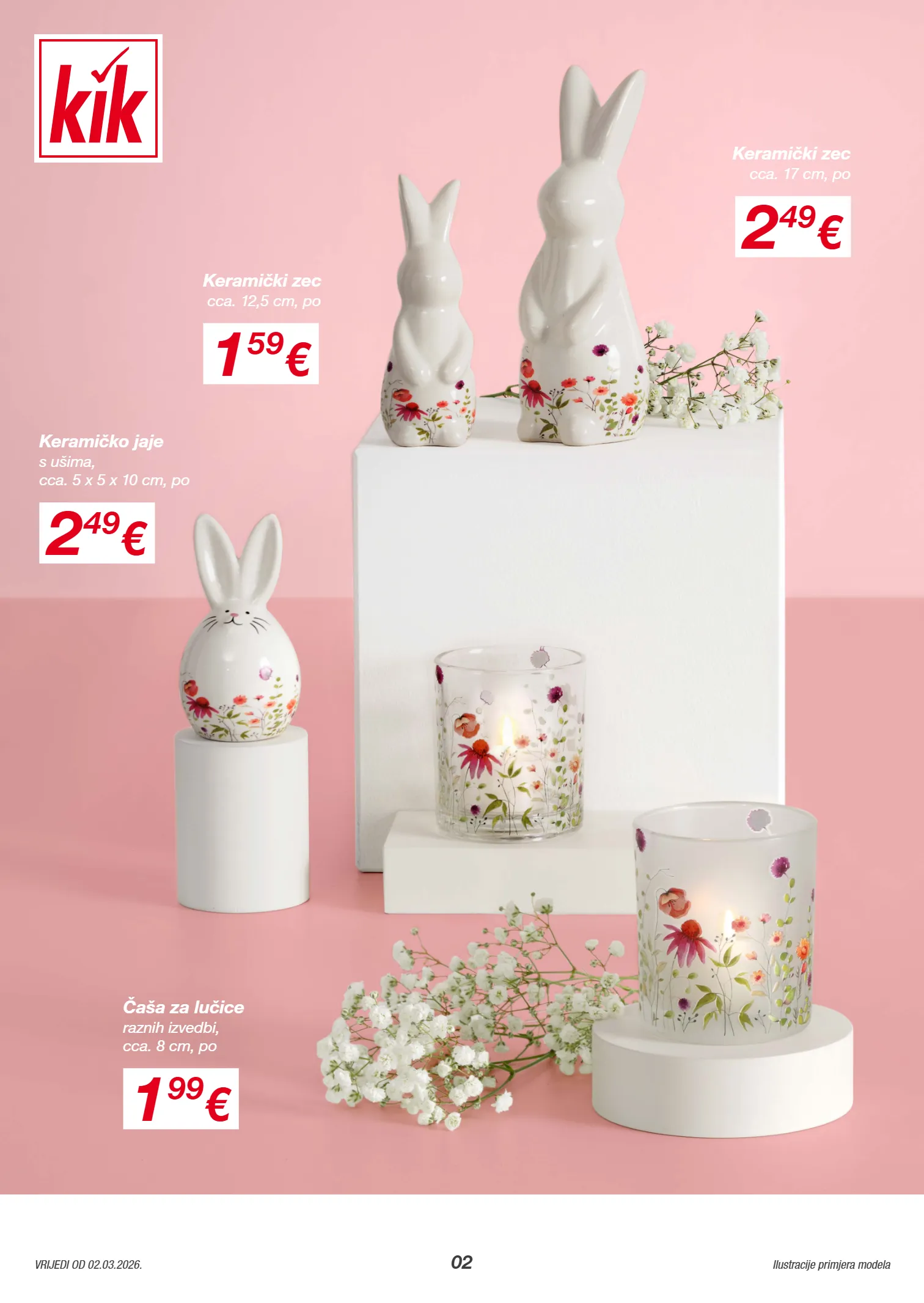 1213133 1213134 1215770 1214008 1213229 1215733 04 Ilustracije primjera modela VRIJEDI OD 02.03.2026. 2 49 € raznih boja, visina cca. 15 cm, po Dekorativni zec 3 99 € raznih boja, visina cca. 30 cm, po Dekorativni zec 1 € 0,25 € / kom. raznih boja, cca. 5 x 4 cm, po Mali dekorativni zec 3 49 € raznih boja, visina cca. 27 cm, po Dekorativni zec 2 49 € raznih boja, visina cca. 30 cm, po Papirnati zec 1 99 € za objesiti, raznih izvedbi, visina cca. 12- 14 cm, po Papirnato jaje 4 KOM PAKIRANJE