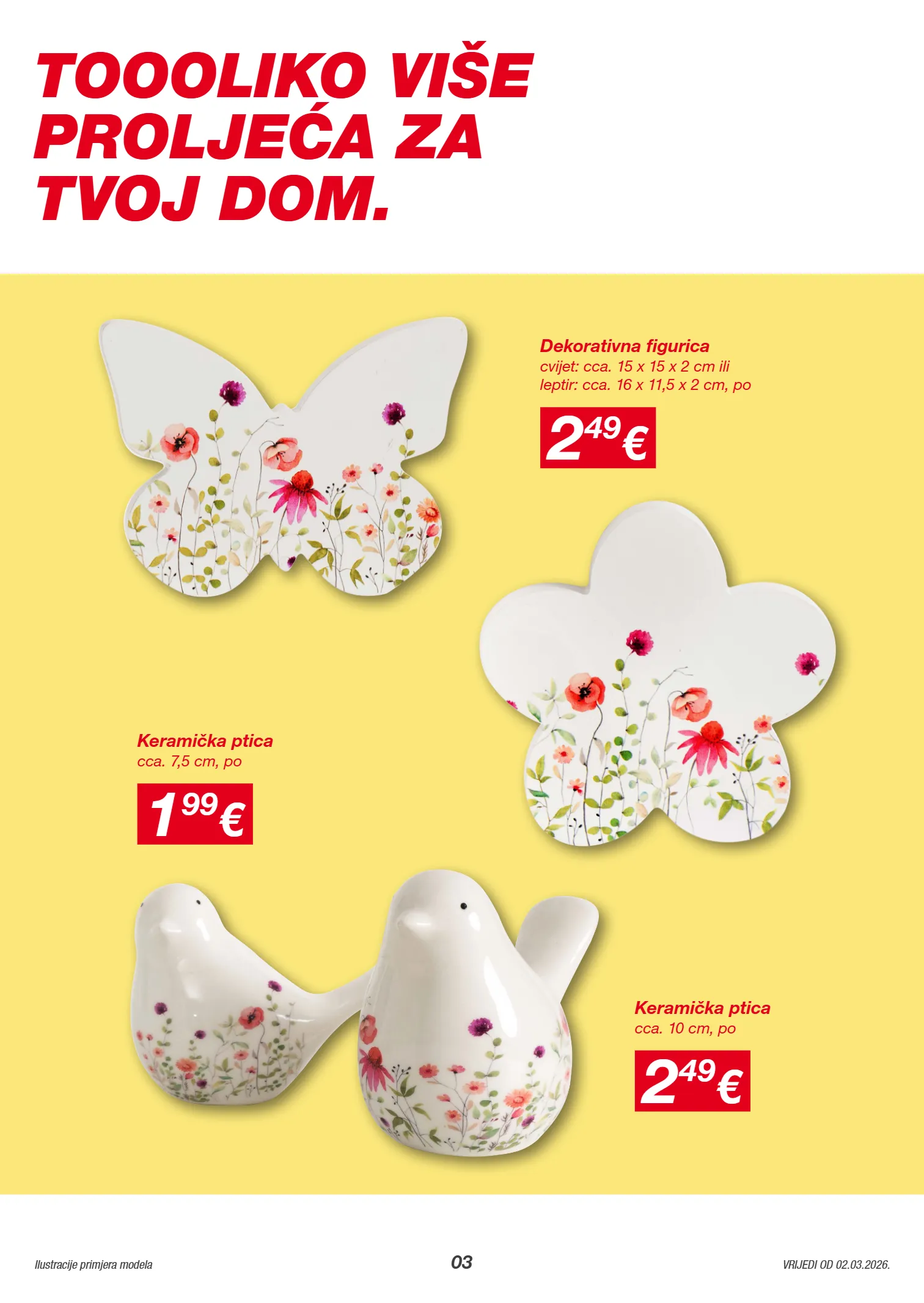 1214856 1214894 1212896 1212896 03 Ilustracije primjera modela VRIJEDI OD 02.03.2026. 2 49 € cca. 10 cm, po Keramička ptica 1 99 € cca. 7,5 cm, po Keramička ptica 2 49 € cvijet: cca. 15 x 15 x 2 cm ili leptir: cca. 16 x 11,5 x 2 cm, po Dekorativna figurica TOOOLIKO VIŠE PROLJEĆA ZA TVOJ DOM.