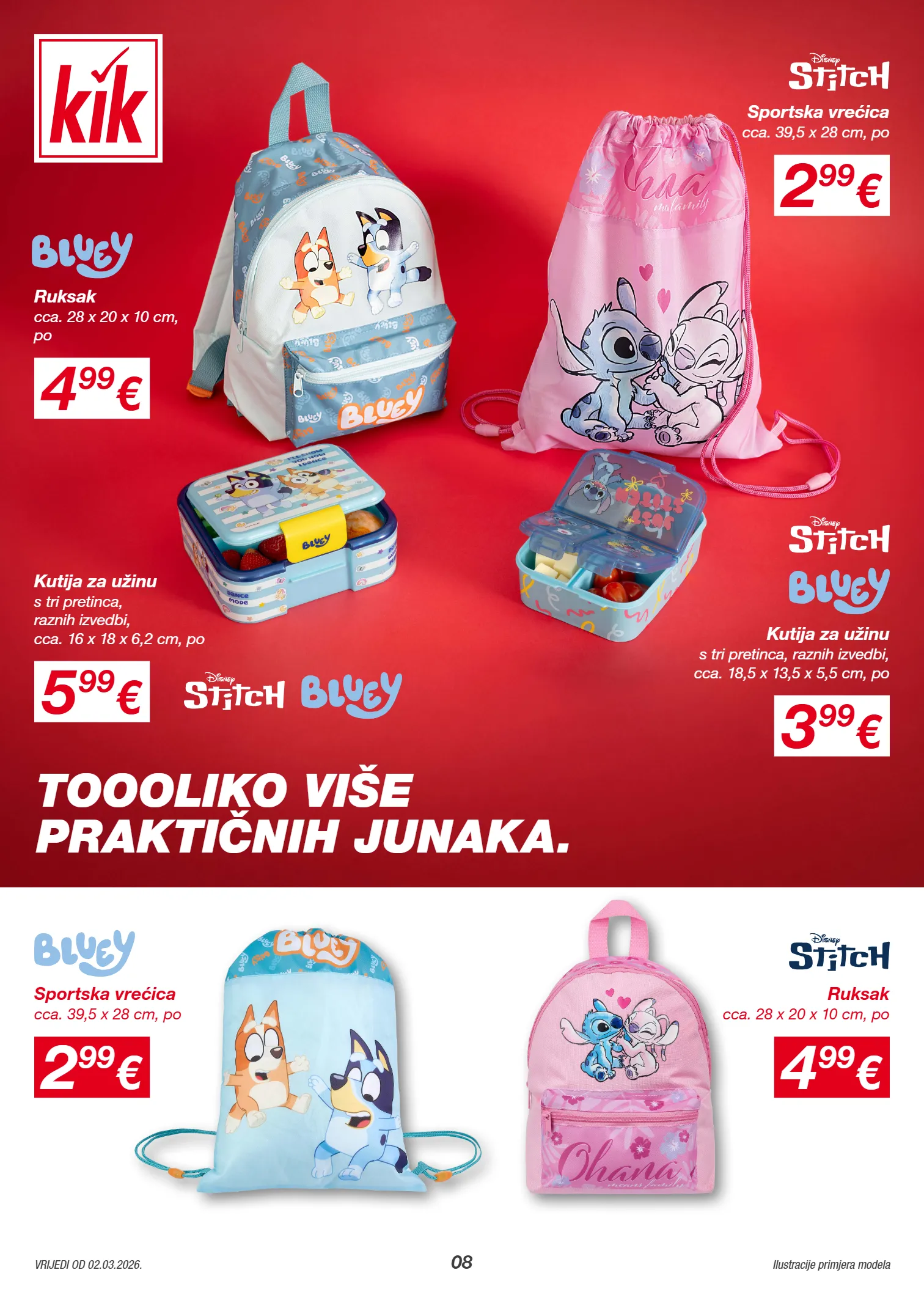 1220436 1211577 1220407 1211613 1220446 1220408 08 ilustracije primjera modela vrijedi od 02.03.2026. 4 99 € cca. 28 x 20 x 10 cm, po ruksak 5 99 € s tri pretinca, raznih izvedbi, cca. 16 x 18 x 6,2 cm, po kutija za užinu 4 99 € cca. 28 x 20 x 10 cm, po ruksak 3 99 € s tri pretinca, raznih izvedbi, cca. 18,5 x 13,5 x 5,5 cm, po kutija za užinu 2 99 € cca. 39,5 x 28 cm, po sportska vrećica 2 99 € cca. 39,5 x 28 cm, po sportska vrećica toooliko više praktičnih junaka.