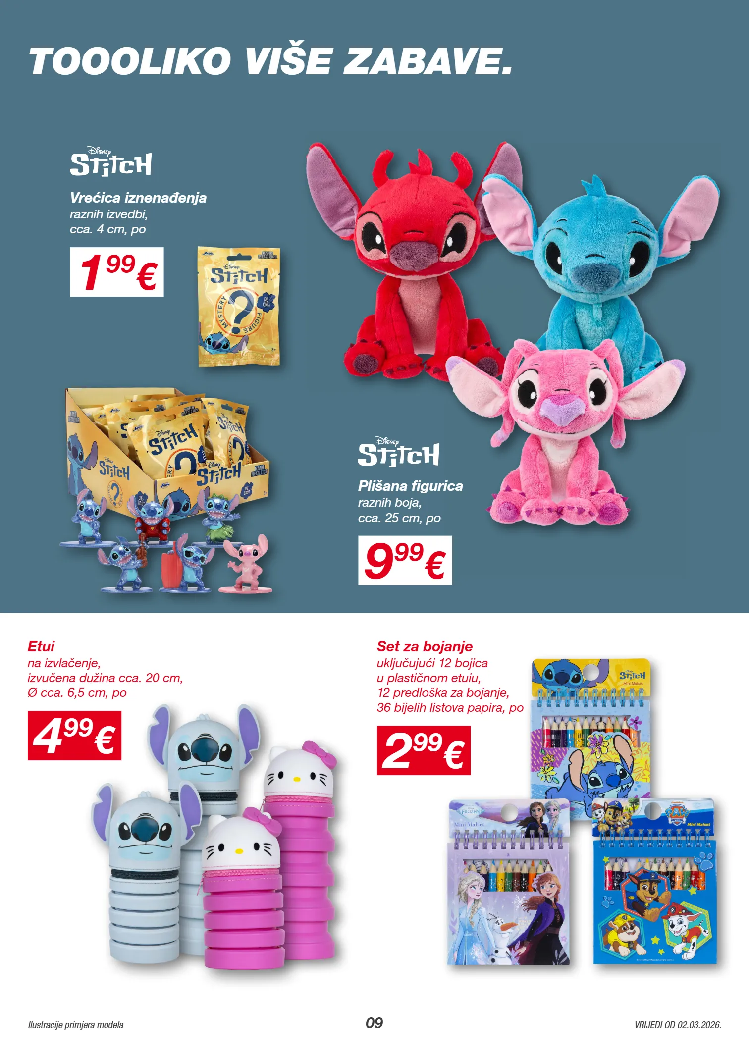 1220218 1213969 1215893 1215922 09 Ilustracije primjera modela VRIJEDI OD 02.03.2026. 1 99 € raznih izvedbi, cca. 4 cm, po Vrećica iznenađenja 9 99 € raznih boja, cca. 25 cm, po Plišana figurica 4 99 € na izvlačenje, izvučena dužina cca. 20 cm, Ø cca. 6,5 cm, po Etui 2 99 € uključujući 12 bojica u plastičnom etuiu, 12 predloška za bojanje, 36 bijelih listova papira, po Set za bojanje TOOOLIKO VIŠE ZABAVE.