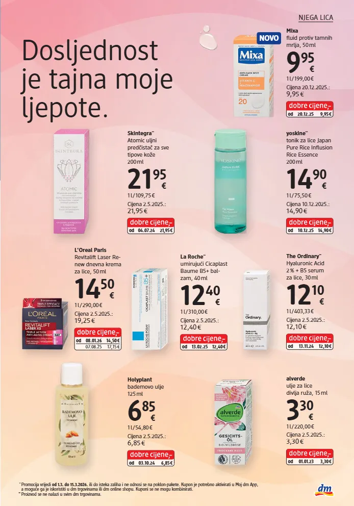 dosljednost je tajna moje ljepote. * promocija vrijedi od 1.3. do 15.3.2026. ili do isteka zaliha i ne odnosi se na poklon-pakete. kupon je potrebno aktivirati u moj dm app, a moguće ga je iskoristiti u dm trgovinama ili dm online shopu. kuponi se ne mogu kombinirati. ** proizvod se ne nalazi u svim dm trgovinama. yoskine ** tonik za lice japan pure rice influsion rice essence 200 ml 14 90 € 1 l / 75,50 € cijena 10.12.2025.: 14,90 € od 10.12.25 14,90 € alverde ulje za lice divlja ruža, 15 ml 3 30 € 1 l / 220,00 € cijena 2.5.2025.: 3,30 € od 01.01.23 3,30 € the ordinary ** hyaluronic acid 2 % + b5 serum za lice, 30 ml 12 10 € 1 l / 403,33 € cijena 2.5.2025.: 12,10 € od 13.11.24 12,10 € holyplant bademovo ulje 125 ml 6 85 € 1 l / 54,80 € cijena 2.5.2025.: 6,85 € od 03.10.24 6,85 € skintegra ** atomic uljni predčistač za sve tipove kože 200 ml 21 95 € 1 l / 109,75 € cijena 2.5.2025.: 21,95 € od 04.07.24 21,95 € novo mixa fluid protiv tamnih mrlja, 50 ml 9 95 € 1 l / 199,00 € cijena 20.12.2025.: 9,95 € od 20.12.25 9,95 € l'oreal paris revitalift laser re- new dnevna krema za lice, 50 ml 14 50 € 1 l / 290,00 € cijena 2.5.2025.: 19,25 € od 08.01.26 14,50 € 07.08.25 17,15 € la roche ** umirujući cicaplast baume b5+ bal- zam, 40 ml 12 40 € 1 l / 310,00 € cijena 2.5.2025.: 12,40 € od 13.02.25 12,40 € njega lica