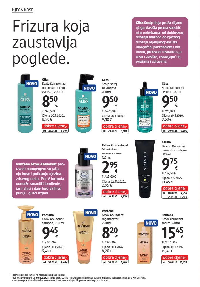 Frizura koja zaustavlja poglede. Gliss Scalp linija pruža ciljanu njegu vlasišta prema specifič- nim potrebama, od dubinskog čišćenja masnog do nježnog čišćenja osjetljivog vlasišta. Obogaćeni pantenolom i bio- tinom, proizvodi revitaliziraju kosu i vlasište, ostavljajući ih svježima i zdravima. Pantene Grow Abundant pro- izvodi namijenjeni su jača- nju kose i poticanju njezina zdravog rasta. Pro-V formula pomaže smanjiti lomljenje, jača vlasi i daje kosi vidljivo puniji i gušći izgled. * Promocija se ne odnosi na proizvode za bebe i djecu. ** Promocija vrijedi od 1.3. do 15.3.2026. ili do isteka zaliha i ne odnosi se na poklon-pakete. Kupon je potrebno aktivirati u Moj dm App, a moguće ga je iskoristiti u dm trgovinama ili dm online shopu. Kuponi se ne mogu kombinirati. NOVO NOVO NOVO NOVO NOVO NOVO Pantene Grow Abundant šampon, 290 ml 9 45 € 1 l / 32,59 € Cijena 30.1.2026.: 9,45 € od 30.01.26 9,45 € Pantene Grow Abundant regenerator 250 ml 8 20 € 1 l / 32,80 € Cijena 30.1.2026.: 8,20 € od 30.01.26 8,20 € Pantene Grow Abundant serum, 60 ml 15 45 € 1 l / 257,50 € Cijena 30.1.2026.: 15,45 € od 30.01.26 15,45 € Gliss Scalp Oil control serum, 100 ml 9 50 € 1 l / 95,00 € Cijena 20.1.2026.: 9,50 € od 20.01.26 9,50 € Gliss Scalp sprej za vlasište 200 ml 9 50 € 1 l / 47,50 € Cijena 20.1.2026.: 9,50 € od 20.01.26 9,50 € Gliss Scalp šampon za dubinsko čišćenje vlasišta, 200 ml 8 50 € 1l / 42,50 € Cijena 20.1.2026.: 8,50 € od 20.01.26 8,50 € Keune Design Repair re- generator za kosu 300 ml 9 75 € 1 l / 32,50 € Cijena 2.5.2025.: 11,45 € od 08.01.26 9,75 € 04.03.25 11,45 € NOVO Balea Professional Glow&Shine serum za kosu 125 ml 2 95 € 1 l / 23,60 € Cijena 22.11.2025.: 2,95 € od 22.11.25 2,95 € NJEGA KOSE