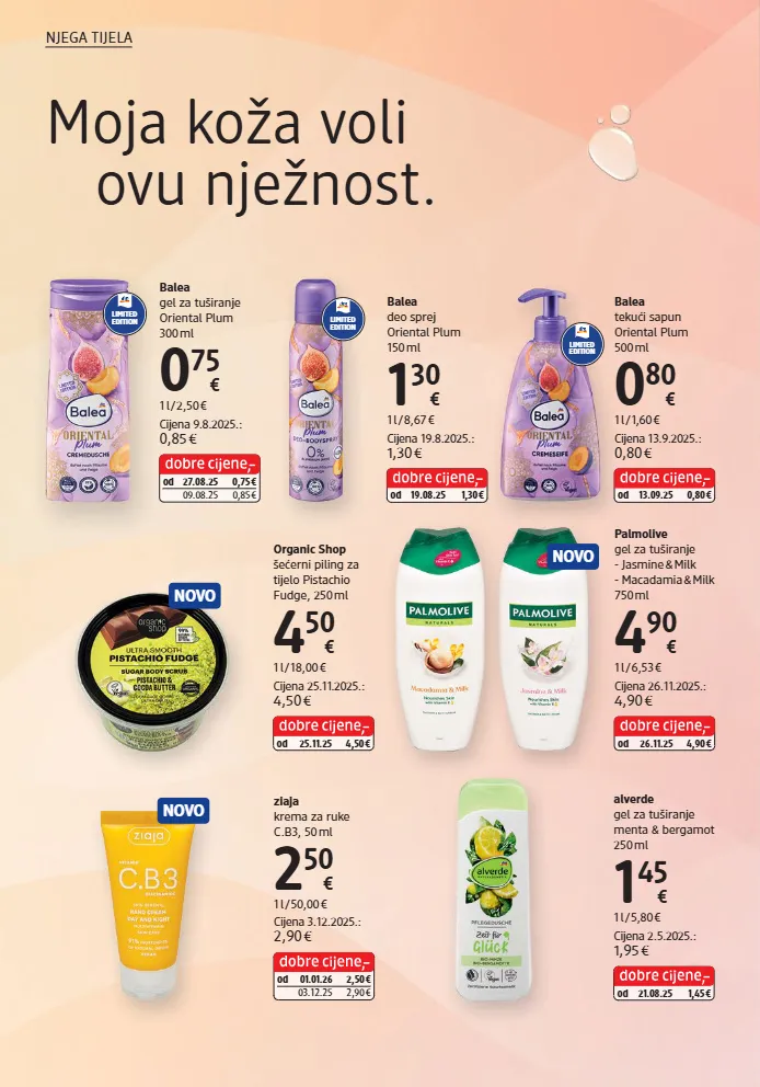 moja koža voli ovu nježnost. novo novo novo organic shop šećerni piling za tijelo pistachio fudge, 250 ml 4 50 € 1 l / 18,00 € cijena 25.11.2025.: 4,50 € od 25.11.25 4,50 € palmolive gel za tuširanje - jasmine & milk - macadamia & milk 750 ml 4 90 € 1 l / 6,53 € cijena 26.11.2025.: 4,90 € od 26.11.25 4,90 € ziaja krema za ruke c.b3, 50 ml 2 50 € 1 l / 50,00 € cijena 3.12.2025.: 2,90 € od 01.01.26 2,50 € 03.12.25 2,90 € balea tekući sapun oriental plum 500 ml 0 80 € 1 l / 1,60 € cijena 13.9.2025.: 0,80 € od 13.09.25 0,80 € balea deo sprej oriental plum 150 ml 1 30 € 1 l / 8,67 € cijena 19.8.2025.: 1,30 € od 19.08.25 1,30 € balea gel za tuširanje oriental plum 300 ml 0 75 € 1 l / 2,50 € cijena 9.8.2025.: 0,85 € od 27.08.25 0,75 € 09.08.25 0,85 € alverde gel za tuširanje menta & bergamot 250 ml 1 45 € 1 l / 5,80 € cijena 2.5.2025.: 1,95 € od 21.08.25 1,45 € limited edition limited edition limited edition njega tijela