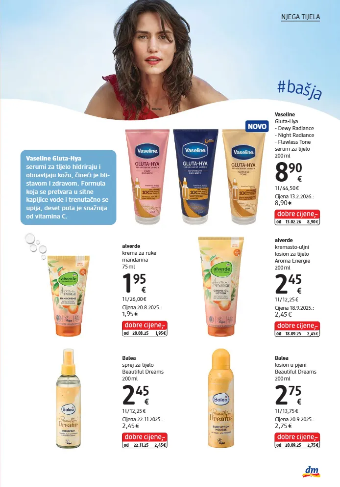 vaseline gluta-hya serumi za tijelo hidriraju i obnavljaju kožu, čineći je bli- stavom i zdravom. formula koja se pretvara u sitne kapljice vode i trenutačno se upija, deset puta je snažnija od vitamina c. novo vaseline gluta-hya - dewy radiance - night radiance - flawless tone serum za tijelo 200 ml 8 90 € 1 l / 44,50 € cijena 13.2.2026.: 8,90 € od 13.02.26 8,90 € balea losion u pjeni beautiful dreams 200 ml 2 75 € 1 l / 13,75 € cijena 20.9.2025.: 2,75 € od 20.09.25 2,75 € balea sprej za tijelo beautiful dreams 200 ml 2 45 € 1 l / 12,25 € cijena 22.11.2025.: 2,45 € od 22.11.25 2,45 € alverde kremasto-uljni losion za tijelo aroma energie 200 ml 2 45 € 1 l / 12,25 € cijena 18.9.2025.: 2,45 € od 18.09.25 2,45 € alverde krema za ruke mandarina 75 ml 1 95 € 1 l / 26,00 € cijena 20.8.2025.: 1,95 € od 20.08.25 1,95 € njega tijela