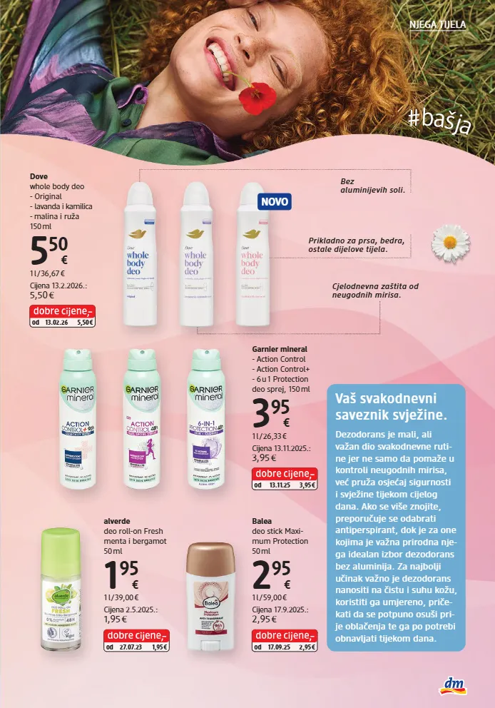 vaš svakodnevni saveznik svježine. dezodorans je mali, ali važan dio svakodnevne ruti- ne jer ne samo da pomaže u kontroli neugodnih mirisa, već pruža osjećaj sigurnosti i svježine tijekom cijelog dana. ako se više znojite, preporučuje se odabrati antiperspirant, dok je za one kojima je važna prirodna nje- ga idealan izbor dezodorans bez aluminija. za najbolji učinak važno je dezodorans nanositi na čistu i suhu kožu, koristiti ga umjereno, priče- kati da se potpuno osuši pri- je oblačenja te ga po potrebi obnavljati tijekom dana. bez aluminijevih soli. prikladno za prsa, bedra, ostale dijelove tijela. cjelodnevna zaštita od neugodnih mirisa. novo dove whole body deo - original - lavanda i kamilica - malina i ruža 150 ml 5 50 € 1 l / 36,67 € cijena 13.2.2026.: 5,50 € od 13.02.26 5,50 € balea deo stick maxi- mum protection 50 ml 2 95 € 1 l / 59,00 € cijena 17.9.2025.: 2,95 € od 17.09.25 2,95 € alverde deo roll-on fresh menta i bergamot 50 ml 1 95 € 1 l / 39,00 € cijena 2.5.2025.: 1,95 € od 27.07.23 1,95 € garnier mineral - action control - action control+ - 6 u 1 protection deo sprej, 150 ml 3 95 € 1 l / 26,33 € cijena 13.11.2025.: 3,95 € od 13.11.25 3,95 € njega tijela