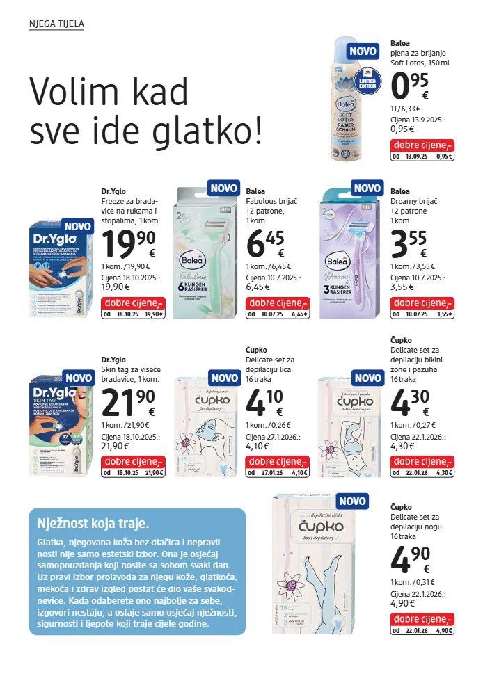 Volim kad sve ide glatko! Nježnost koja traje. Glatka, njegovana koža bez dlačica i nepravil- nosti nije samo estetski izbor. Ona je osjećaj samopouzdanja koji nosite sa sobom svaki dan. Uz pravi izbor proizvoda za njegu kože, glatkoća, mekoća i zdrav izgled postat će dio vaše svakod- nevice. Kada odaberete ono najbolje za sebe, izgovori nestaju, a ostaje samo osjećaj nježnosti, sigurnosti i ljepote koji traje cijele godine. NOVO NOVO NOVO NOVO NOVO NOVO NOVO NOVO Čupko Delicate set za depilaciju lica 16 traka 4 10 € 1 kom. / 0,26 € Cijena 27.1.2026.: 4,10 € od 27.01.26 4,10 € Čupko Delicate set za depilaciju bikini zone i pazuha 16 traka 4 30 € 1 kom. / 0,27 € Cijena 22.1.2026.: 4,30 € od 22.01.26 4,30 € Čupko Delicate set za depilaciju nogu 16 traka 4 90 € 1 kom. / 0,31 € Cijena 22.1.2026.: 4,90 € od 22.01.26 4,90 € Balea pjena za brijanje Soft Lotos, 150 ml 0 95 € 1 l / 6,33 € Cijena 13.9.2025.: 0,95 € od 13.09.25 0,95 € Balea Dreamy brijač +2 patrone 1 kom. 3 55 € 1 kom. / 3,55 € Cijena 10.7.2025.: 3,55 € od 10.07.25 3,55 € Balea Fabulous brijač +2 patrone, 1 kom. 6 45 € 1 kom. / 6,45 € Cijena 10.7.2025.: 6,45 € od 10.07.25 6,45 € Dr.Yglo Freeze za brada- vice na rukama i stopalima, 1 kom. 19 90 € 1 kom. / 19,90 € Cijena 18.10.2025.: 19,90 € od 18.10.25 19,90 € Dr.Yglo Skin tag za viseće bradavice, 1 kom. 21 90 € 1 kom. / 21,90 € Cijena 18.10.2025.: 21,90 € od 18.10.25 21,90 € LIMITED EDITION NJEGA TIJELA