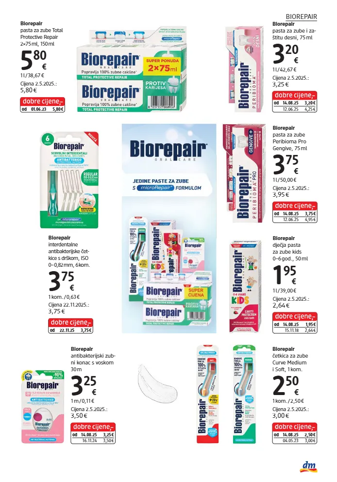 biorepair pasta za zube peribioma pro gengive, 75 ml 3 75 € 1 l / 50,00 € cijena 2.5.2025.: 3,95 € od 14.08.25 3,75 € 12.06.25 4,95 € biorepair pasta za zube i za- štitu desni, 75 ml 3 20 € 1 l / 42,67 € cijena 2.5.2025.: 3,25 € od 14.08.25 3,20 € 12.06.25 4,25 € biorepair četkica za zube curve medium i soft, 1 kom. 2 50 € 1 kom. / 2,50 € cijena 2.5.2025.: 3,00 € od 14.08.25 2,50 € 04.05.23 3,00 € biorepair antibakterijski zub- ni konac s voskom 30 m 3 25 € 1 m / 0,11 € cijena 2.5.2025.: 3,50 € od 14.08.25 3,25 € 16.11.24 3,50 € biorepair dječja pasta za zube kids 0–6 god., 50 ml 1 95 € 1 l / 39,00 € cijena 2.5.2025.: 2,64 € od 14.08.25 1,95 € 15.11.18 2,64 € biorepair pasta za zube total protective repair 2×75 ml, 150 ml 5 80 € 1 l / 38,67 € cijena 2.5.2025.: 5,80 € od 01.06.23 5,80 € biorepair interdentalne anti bakterijske čet- kice s drškom, iso 0– 0,82 mm, 6 kom. 3 75 € 1 kom. / 0,63 € cijena 22.11.2025.: 3,75 € od 22.11.25 3,75 € biorepair