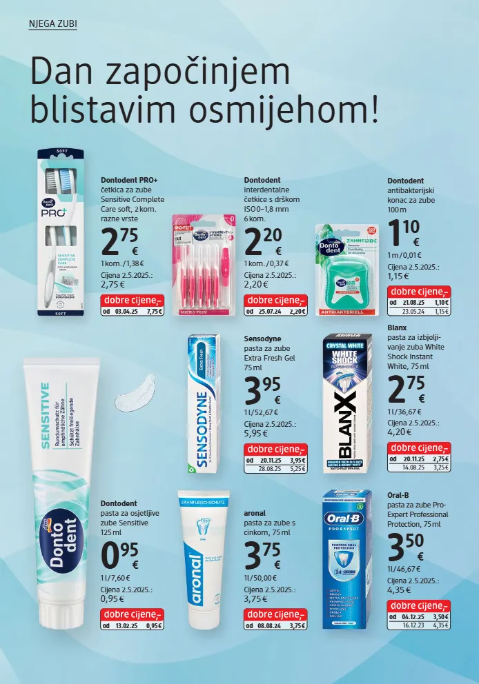 dan započinjem blistavim osmijehom! dontodent pasta za osjetljive zube sensitive 125 ml 0 95 € 1 l / 7,60 € cijena 2.5.2025.: 0,95 € od 13.02.25 0,95 € sensodyne pasta za zube extra fresh gel 75 ml 3 95 € 1 l / 52,67 € cijena 2.5.2025.: 5,95 € od 20.11.25 3,95 € 28.08.25 5,25 € blanx pasta za izbjelji- vanje zuba white shock instant white, 75 ml 2 75 € 1 l / 36,67 € cijena 2.5.2025.: 4,20 € od 20.11.25 2,75 € 14.08.25 3,25 € aronal pasta za zube s cinkom, 75 ml 3 75 € 1l / 50,00 € cijena 2.5.2025.: 3,75 € od 08.08.24 3,75 € oral-b pasta za zube pro- expert professional protection, 75 ml 3 50 € 1l / 46,67 € cijena 2.5.2025.: 4,35 € od 04.12.25 3,50 € 16.12.23 4,35 € dontodent antibakterijski konac za zube 100 m 1 10 € 1 m / 0,01 € cijena 2.5.2025.: 1,15 € od 21.08.25 1,10 € 23.05.24 1,15 € dontodent pro+ četkica za zube sensitive complete care soft, 2 kom. razne vrste 2 75 € 1 kom. / 1,38 € cijena 2.5.2025.: 2,75 € od 03.04.25 7,75 € dontodent interdentalne četkice s drškom iso 0–1,8 mm 6 kom. 2 20 € 1 kom. / 0,37 € cijena 2.5.2025.: 2,20 € od 25.07.24 2,20 € njega zubi