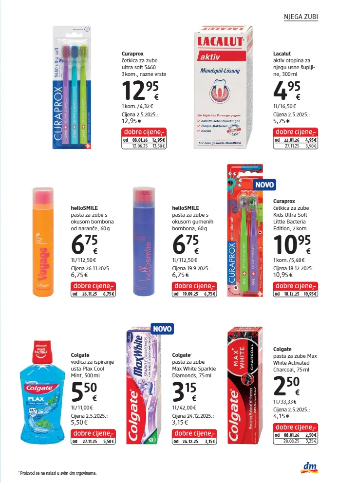 * proizvod se ne nalazi u svim dm trgovinama. novo novo colgate * pasta za zube max white sparkle diamonds, 75 ml 3 15 € 1 l / 42,00 € cijena 24.12.2025.: 3,15 € od 24.12.25 3,15 € colgate pasta za zube max white activated charcoal, 75 ml 2 50 € 1 l / 33,33 € cijena 2.5.2025.: 4,15 € od 08.01.26 2,50 € 28.08.25 3,25 € hellosmile pasta za zube s okusom bombona od naranče, 60 g 6 75 € 1l / 112,50 € cijena 26.11.2025.: 6,75 € od 26.11.25 6,75 € hellosmile pasta za zube s okusom gumenih bombona, 60 g 6 75 € 1l / 112,50 € cijena 19.9.2025.: 6,75 € od 19.09.25 6,75 € curaprox četkica za zube ultra soft 5460 3 kom., razne vrste 12 95 € 1 kom. / 4,32 € cijena 2.5.2025.: 12,95 € od 08.01.26 12,95 € 12.06.25 13,50 € colgate vodica za ispiranje usta plax cool mint, 500 ml 5 50 € 1l / 11,00 € cijena 2.5.2025.: 5,50 € od 27.11.25 5,50 € lacalut aktiv otopina za njegu usne šuplji- ne, 300 ml 4 95 € 1l / 16,50 € cijena 2.5.2025.: 5,75 € od 22.01.26 4,95 € 27.11.25 5,90 € curaprox četkica za zube kids ultra soft little bacteria edition, 2 kom. 10 95 € 1 kom. / 5,48 € cijena 18.12.2025.: 10,95 € od 18.12.25 10,95 € njega zubi