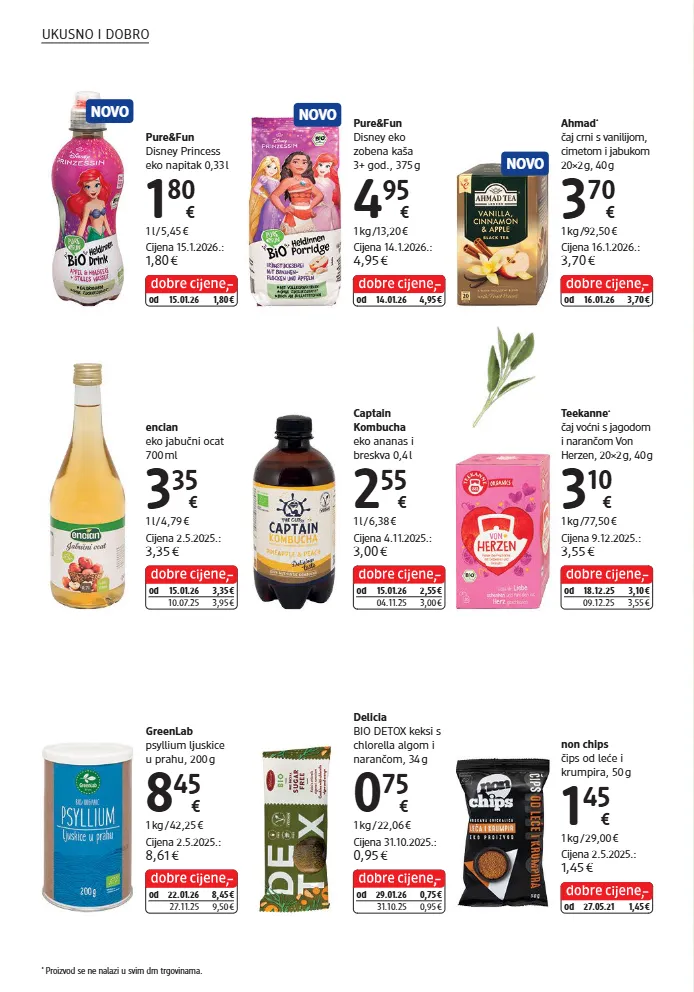 * proizvod se ne nalazi u svim dm trgovinama. novo novo novo encian eko jabučni ocat 700 ml 3 35 € 1 l / 4,79 € cijena 2.5.2025.: 3,35 € od 15.01.26 3,35 € 10.07.25 3,95 € captain kombucha eko ananas i breskva 0,4 l 2 55 € 1 l / 6,38 € cijena 4.11.2025.: 3,00 € od 15.01.26 2,55 € 04.11.25 3,00 € non chips čips od leće i krumpira, 50 g 1 45 € 1 kg / 29,00 € cijena 2.5.2025.: 1,45 € od 27.05.21 1,45 € greenlab psyllium ljuskice u prahu, 200 g 8 45 € 1 kg / 42,25 € cijena 2.5.2025.: 8,61 € od 22.01.26 8,45 € 27.11.25 9,50 € delicia bio detox keksi s chlorella algom i narančom, 34 g 0 75 € 1 kg / 22,06 € cijena 31.10.2025.: 0,95 € od 29.01.26 0,75 € 31.10.25 0,95 € pure&fun disney princess eko napitak 0,33 l 1 80 € 1 l / 5,45 € cijena 15.1.2026.: 1,80 € od 15.01.26 1,80 € pure&fun disney eko zobena kaša 3+ god., 375 g 4 95 € 1 kg /13,20 € cijena 14.1.2026.: 4,95 € od 14.01.26 4,95 € ahmad * čaj crni s vanilijom, cimetom i jabukom 20×2 g, 40 g 3 70 € 1 kg /92,50 € cijena 16.1.2026.: 3,70 € od 16.01.26 3,70 € teekanne * čaj voćni s jagodom i narančom von herzen, 20×2 g, 40 g 3 10 € 1 kg /77,50 € cijena 9.12.2025.: 3,55 € od 18.12.25 3,10 € 09.12.25 3,55 € ukusno i dobro