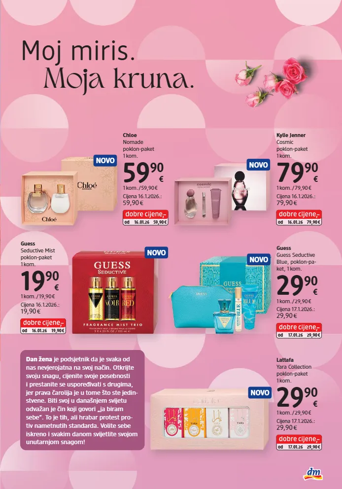 Moj miris. Moja kruna. Dan žena je podsjetnik da je svaka od nas nevjerojatna na svoj način. Otkrijte svoju snagu, cijenite svoje posebnosti i prestanite se uspoređivati s drugima, jer prava čarolija je u tome što ste jedin- stvene. Biti svoj u današnjem svijetu odvažan je čin koji govori „ja biram sebe“. To je tih, ali hrabar protest pro- tiv nametnutih standarda. Volite sebe iskreno i svakim danom svijetlite svojom unutarnjom snagom! Guess Seductive Mist poklon-paket 1 kom. 19 90 € 1 kom. / 19,90 € Cijena 16.1.2026.: 19,90 € od 16.01.26 19,90 € NOVO NOVO NOVO Lattafa Yara Collection poklon-paket 1 kom. 29 90 € 1 kom. / 29,90 € Cijena 17.1.2026.: 29,90 € od 17.01.26 29,90 € Guess Guess Seductive Blue, poklon-pa- ket, 1 kom. 29 90 € 1 kom. / 29,90 € Cijena 17.1.2026.: 29,90 € od 17.01.26 29,90 € NOVO NOVO Chloe Nomade poklon-paket 1 kom. 59 90 € 1 kom. / 59,90 € Cijena 16.1.2026.: 59,90 € od 16.01.26 59,90 € Kylie Jenner Cosmic poklon-paket 1 kom. 79 90 € 1 kom. / 79,90 € Cijena 16.1.2026.: 79,90 € od 16.01.26 79,90 €
