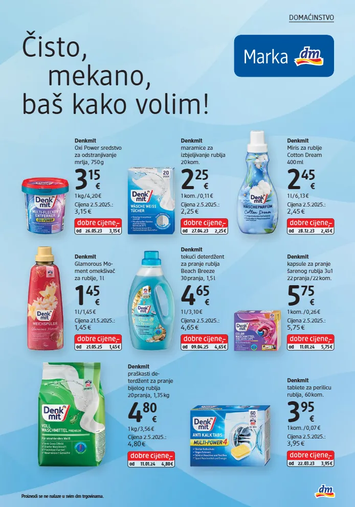 proizvodi se ne nalaze u svim dm trgovinama. proizvodi se ne nalaze u svim dm trgovinama. čisto, mekano, baš kako volim! denkmit oxi power sredstvo za odstranjivanje mrlja, 750 g 3 15 € 1 kg / 4,20 € cijena 2.5.2025.: 3,15 € od 26.05.23 3,15 € denkmit maramice za izbjeljivanje rublja 20 kom. 2 25 € 1 kom. / 0,11 € cijena 2.5.2025.: 2,25 € od 27.04.23 2,25 € denkmit glamorous mo- ment omekšivač za rublje, 1 l 1 45 € 1 l / 1,45 € cijena 21.5.2025.: 1,45 € od 21.05.25 1,45 € denkmit kapsule za pranje šarenog rublja 3u1 22 pranja / 22 kom. 5 75 € 1 kom. / 0,26 € cijena 2.5.2025.: 5,75 € od 11.01.24 5,75 € denkmit praškasti de- terdžent za pranje bijelog rublja 20 pranja, 1,35 kg 4 80 € 1 kg / 3,56 € cijena 2.5.2025.: 4,80 € od 11.01.24 4,80 € denkmit tekući deterdžent za pranje rublja beach breeze 30 pranja, 1,5 l 4 65 € 1 l / 3,10 € cijena 2.5.2025.: 4,65 € od 09.04.25 4,65 € denkmit tablete za perilicu rublja, 60 kom. 3 95 € 1 kom. / 0,07 € cijena 2.5.2025.: 3,95 € od 22.03.23 3,95 € denkmit miris za rublje cotton dream 400 ml 2 45 € 1 l / 6,13 € cijena 2.5.2025.: 2,45 € od 28.12.23 2,45 € domaćinstvo