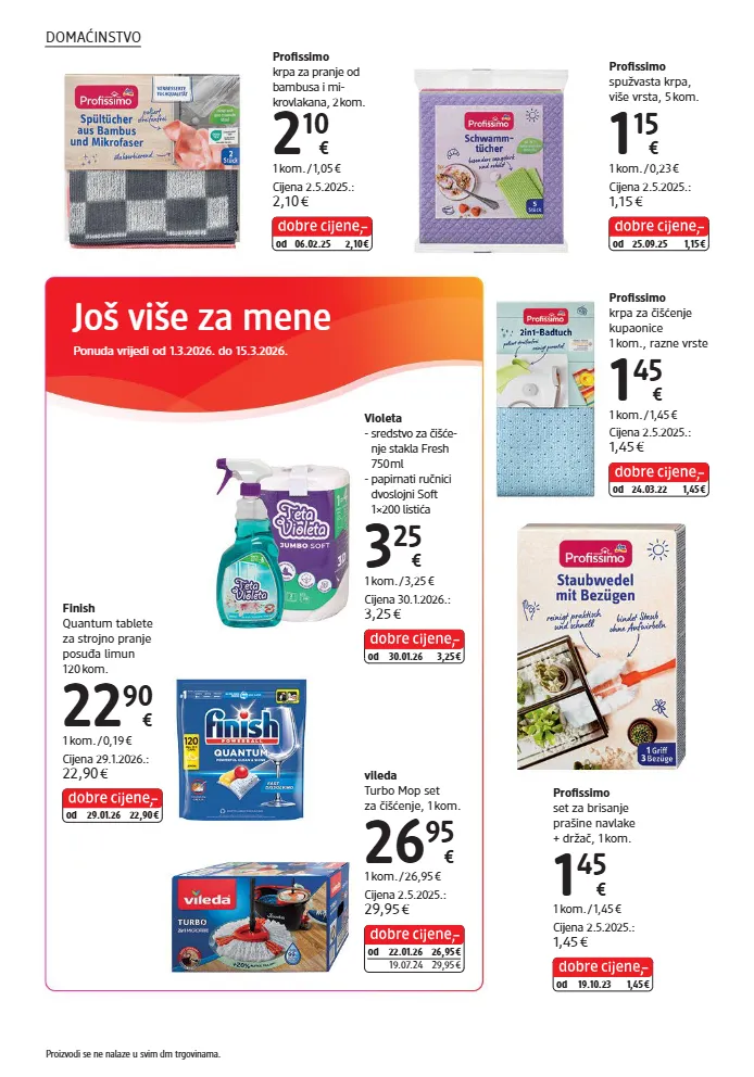 još više za mene proizvodi se ne nalaze u svim dm trgovinama. ponuda vrijedi od 1.3.2026. do 15.3.2026. profissimo set za brisanje prašine navlake + držač, 1 kom. 1 45 € 1 kom. / 1,45 € cijena 2.5.2025.: 1,45 € od 19.10.23 1,45 € profissimo krpa za čišćenje kupaonice 1 kom., razne vrste 1 45 € 1 kom. / 1,45 € cijena 2.5.2025.: 1,45 € od 24.03.22 1,45 € vileda turbo mop set za čišćenje, 1 kom. 26 95 € 1 kom. / 26,95 € cijena 2.5.2025.: 29,95 € od 22.01.26 26,95 € 19.07.24 29,95 € violeta - sredstvo za čišće- nje stakla fresh 750 ml - papirnati ručnici dvoslojni soft 1×200 listića 3 25 € 1 kom. / 3,25 € cijena 30.1.2026.: 3,25 € od 30.01.26 3,25 € finish quantum tablete za strojno pranje posuđa limun 120 kom. 22 90 € 1 kom. / 0,19 € cijena 29.1.2026.: 22,90 € od 29.01.26 22,90 € profissimo krpa za pranje od bambusa i mi- krovlakana, 2 kom. 2 10 € 1 kom. / 1,05 € cijena 2.5.2025.: 2,10 € od 06.02.25 2,10 € profissimo spužvasta krpa, više vrsta, 5 kom. 1 15 € 1 kom. / 0,23 € cijena 2.5.2025.: 1,15 € od 25.09.25 1,15 € domaćinstvo