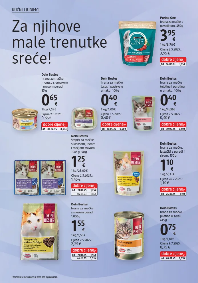 za njihove male trenutke sreće! proizvodi se ne nalaze u svim dm trgovinama. purina one hrana za mačke s govedinom, 450 g 3 95 € 1 kg / 8,78 € cijena 2.5.2025.: 3,95 € od 16.02.23 3,95 € dein bestes hrana za mačke, jastučići s peradi i sirom, 150 g 1 10 € 1 kg / 7,33 € cijena 26.7.2025.: 1,10 € od 26.07.25 1,10 € dein bestes hrana za mačke mousse s umakom i mesom peradi 85 g 0 65 € 1 kg / 7,65 € cijena 2.5.2025.: 0,65 € od 03.04.25 0,65 € dein bestes hrana za mačke losos i pastrva u umaku, 100 g 0 40 € 1 kg / 4,00 € cijena 2.5.2025.: 0,40 € od 30.05.24 0,40 € dein bestes hrana za mačke teletina i puretina u umaku, 100 g 0 40 € 1 kg / 4,00 € cijena 2.5.2025.: 0,40 € od 30.05.24 0,40 € dein bestes hrana za mačke piletina u želeu 415 g 0 75 € 1 kg / 1,81 € cijena 9.7.2025.: 0,75 € od 09.07.25 0,75 € dein bestes hrana za mačke s mesom peradi 1.000 g 1 55 € 1 kg / 1,55 € cijena 2.5.2025.: 2,25 € od 21.08.25 1,55 € 04.05.23 2,25 € dein bestes štapići za mačke s lososom, listom i mačjom travom 10×5 g, 50 g 1 25 € 1 kg / 25,00 € cijena 2.5.2025.: 1,45 € od 21.08.25 1,25 € 04.05.23 1,45 € kućni ljubimci