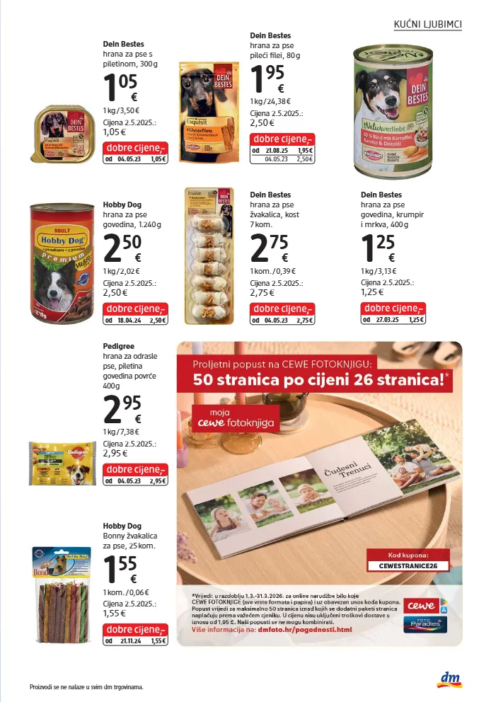 proizvodi se ne nalaze u svim dm trgovinama. hobby dog bonny žvakalica za pse, 25 kom. 1 55 € 1 kom. / 0,06 € cijena 2.5.2025.: 1,55 € od 21.11.24 1,55 € dein bestes hrana za pse pileći filei, 80 g 1 95 € 1 kg / 24,38 € cijena 2.5.2025.: 2,50 € od 21.08.25 1,95 € 04.05.23 2,50 € dein bestes hrana za pse s piletinom, 300 g 1 05 € 1 kg / 3,50 € cijena 2.5.2025.: 1,05 € od 04.05.23 1,05 € dein bestes hrana za pse žvakalica, kost 7 kom. 2 75 € 1 kom. / 0,39 € cijena 2.5.2025.: 2,75 € od 04.05.23 2,75 € dein bestes hrana za pse govedina, krumpir i mrkva, 400 g 1 25 € 1 kg / 3,13 € cijena 2.5.2025.: 1,25 € od 27.03.25 1,25 € hobby dog hrana za pse govedina, 1.240 g 2 50 € 1 kg / 2,02 € cijena 2.5.2025.: 2,50 € od 18.04.24 2,50 € pedigree hrana za odrasle pse, piletina govedina povrće 400 g 2 95 € 1 kg / 7,38 € cijena 2.5.2025.: 2,95 € od 04.05.23 2,95 € kućni ljubimci