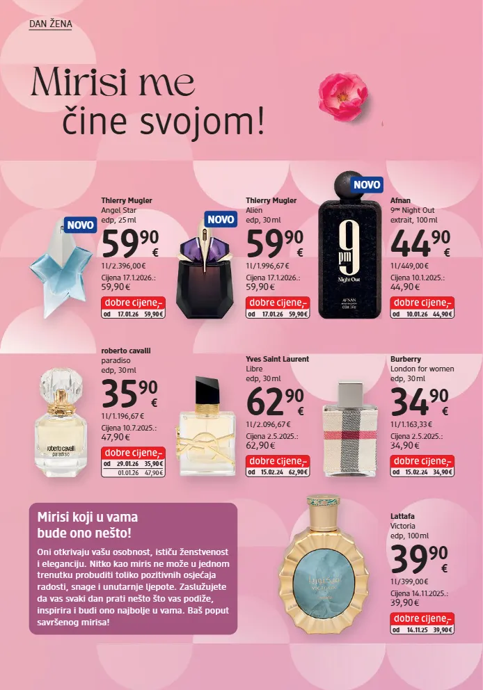 Mirisi me čine svojom! Mirisi koji u vama bude ono nešto! Oni otkrivaju vašu osobnost, ističu ženstvenost i eleganciju. Nitko kao miris ne može u jednom trenutku probuditi toliko pozitivnih osjećaja radosti, snage i unutarnje ljepote. Zaslužujete da vas svaki dan prati nešto što vas podiže, inspirira i budi ono najbolje u vama. Baš poput savršenog mirisa! NOVO NOVO NOVO Thierry Mugler Angel Star edp, 25 ml 59 90 € 1 l / 2.396,00 € Cijena 17.1.2026.: 59,90 € od 17.01.26 59,90 € Thierry Mugler Alien edp, 30 ml 59 90 € 1 l / 1.996,67 € Cijena 17.1.2026.: 59,90 € od 17.01.26 59,90 € Yves Saint Laurent Libre edp, 30 ml 62 90 € 1 l / 2.096,67 € Cijena 2.5.2025.: 62,90 € od 15.02.24 62,90 € Burberry London for women edp, 30 ml 34 90 € 1 l / 1.163,33 € Cijena 2.5.2025.: 34,90 € od 15.02.24 34,90 € Lattafa Victoria edp, 100 ml 39 90 € 1 l / 399,00 € Cijena 14.11.2025.: 39,90 € od 14.11.25 39,90 € Afnan 9 PM Night Out extrait, 100 ml 44 90 € 1 l / 449,00 € Cijena 10.1.2025.: 44,90 € od 10.01.26 44,90 € roberto cavalli paradiso edp, 30 ml 35 90 € 1 l / 1.196,67 € Cijena 10.7.2025.: 47,90 € od 29.01.26 35,90 € 01.01.26 47,90 € DAN ŽENA