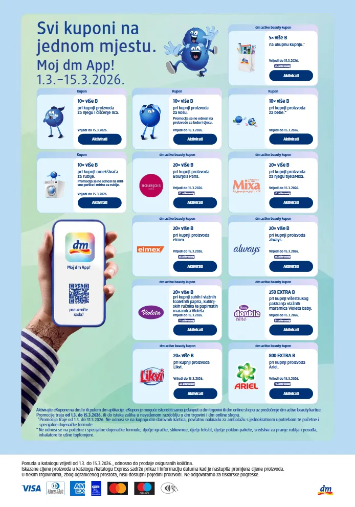 ponuda u katalogu vrijedi od 1.3. do 15.3.2026., odnosno do prodaje osiguranih količina. iskazane cijene proizvoda u katalogu / katalogu express sadrže prikaz i informaciju datuma kad je nastupila promjena cijene proizvoda. u nekim trgovinama, zbog ograničenog prostora, nisu dostupni pojedini proizvodi. ne odgovaramo za tiskarske pogreške. dm active beauty kupon aktivirati 5× više b na ukupnu kupnju. * vrijedi do 31.3.2026. active beauty dm active beauty kupon aktivirati 20× više b pri kupnji proizvoda elmex. vrijedi do 15.3.2026. active beauty dm active beauty kupon aktivirati 250 extra b pri kupnji višestrukog pakiranja vlažnih maramica violeta baby. vrijedi do 15.3.2026. active beauty dm active beauty kupon aktivirati 20× više b pri kupnji proizvoda always. vrijedi do 15.3.2026. active beauty dm active beauty kupon aktivirati 20× više b pri kupnji proizvoda za njegu tijelamixa. vrijedi do 15.3.2026. active beauty dm active beauty kupon aktivirati 20× više b pri kupnji proizvoda bourjois paris. vrijedi do 15.3.2026. active beauty dm active beauty kupon aktivirati 20× više b pri kupnji proizvoda likvi. vrijedi do 15.3.2026. active beauty dm active beauty kupon aktivirati 800 extra b pri kupnji proizvoda ariel. vrijedi do 15.3.2026. active beauty kupon aktivirati 10× više b pri kupnji proizvoda za bebe. ** vrijedi do 15.3.2026. kupon aktivirati 10× više b pri kupnji proizvoda za njegu i čišćenje lica. vrijedi do 15.3.2026. kupon aktivirati 10× više b pri kupnji proizvoda za kosu. promocija se ne odnosi na proizvode za bebe i djecu. vrijedi do 15.3.2026. kupon aktivirati 10× više b pri kupnji omekšivača za rublje. promocija se ne odnosi na miri- sne perlice i mirise za rublje. vrijedi do 15.3.2026. dm active beauty kupon aktivirati 20× više b pri kupnji suhih i vlažnih toaletnih papira, kuhinj- skih ručnika te papirnatih maramica violeta. vrijedi do 15.3.2026. active beauty svi kuponi na jednom mjestu. moj dm app! 1.3.–15.3.2026. aktivirajte ekupone na dm.hr ili putem dm aplikacije. ekupon je moguće iskoristiti samo jedanput u dm trgovini ili dm online shopu uz predočenje dm active beauty kartice. promocije traju od 1.3. do 15.3.2026. ili do isteka zaliha u navedenom razdoblju u dm trgovini i dm online shopu. * promocija traje od 1.3. do 31.3.2026. ne odnosi se na kupnju dm darovnih kartica, povratnu naknadu za ambalažu s jednokratnom upotrebom te početne i specijalne dojenačke formule. ** ne odnosi se na početne i specijalne dojenačke formule, dječje igračke, slikovnice, dječji tekstil, dječje poklon-pakete, sredstva za pranje rublja i posuđa, inhalatore te ušne toplomjere.