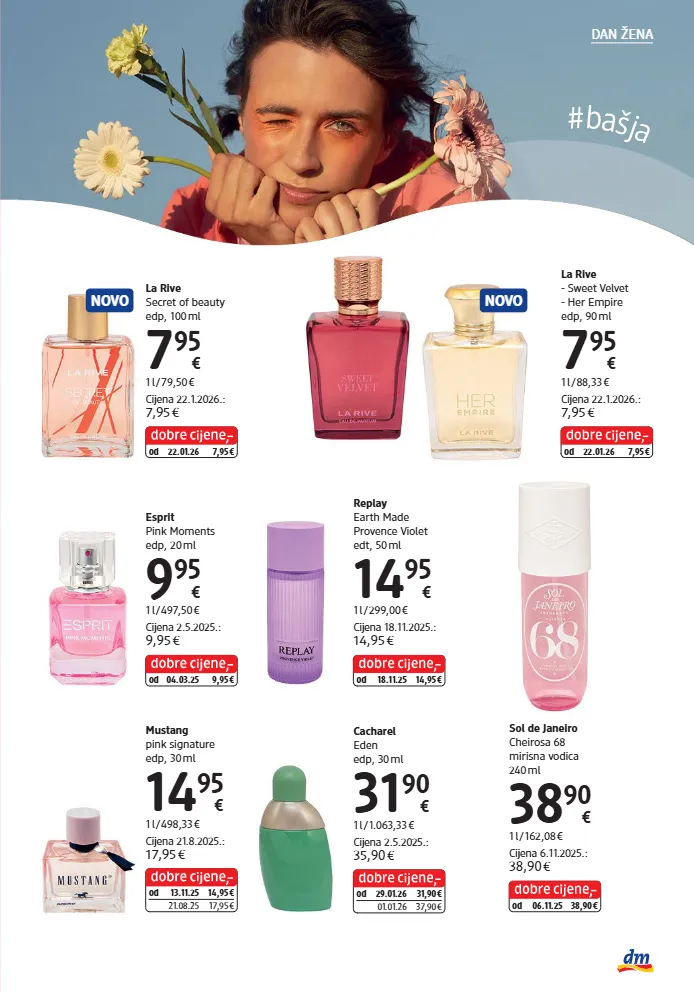 novo novo esprit pink moments edp, 20 ml 9 95 € 1 l / 497,50 € cijena 2.5.2025.: 9,95 € od 04.03.25 9,95 € mustang pink signature edp, 30 ml 14 95 € 1 l / 498,33 € cijena 21.8.2025.: 17,95 € od 13.11.25 14,95 € 21.08.25 17,95 € sol de janeiro cheirosa 68 mirisna vodica 240 ml 38 90 € 1 l / 162,08 € cijena 6.11.2025.: 38,90 € od 06.11.25 38,90 € la rive secret of beauty edp, 100 ml 7 95 € 1 l / 79,50 € cijena 22.1.2026.: 7,95 € od 22.01.26 7,95 € la rive - sweet velvet - her empire edp, 90 ml 7 95 € 1 l / 88,33 € cijena 22.1.2026.: 7,95 € od 22.01.26 7,95 € replay earth made provence violet edt, 50 ml 14 95 € 1 l / 299,00 € cijena 18.11.2025.: 14,95 € od 18.11.25 14,95 € cacharel eden edp, 30 ml 31 90 € 1 l / 1.063,33 € cijena 2.5.2025.: 35,90 € od 29.01.26 31,90 € 01.01.26 37,90 € dan žena