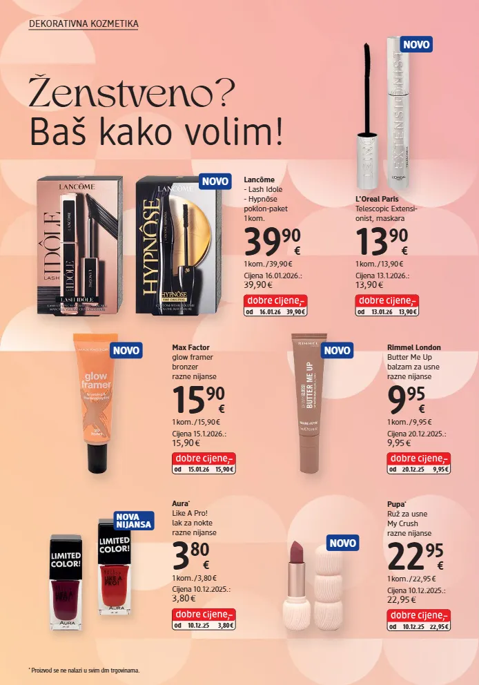 ženstveno? baš kako volim! * proizvod se ne nalazi u svim dm trgovinama. novo novo novo novo novo l'oreal paris telescopic extensi- onist, maskara 13 90 € 1 kom. / 13,90 € cijena 13.1.2026.: 13,90 € od 13.01.26 13,90 € pupa * ruž za usne my crush razne nijanse 22 95 € 1 kom. / 22,95 € cijena 10.12.2025.: 22,95 € od 10.12.25 22,95 € lancôme - lash idole - hypnôse poklon-paket 1 kom. 39 90 € 1 kom. / 39,90 € cijena 16.01.2026.: 39,90 € od 16.01.26 39,90 € aura * like a pro! lak za nokte razne nijanse 3 80 € 1 kom. / 3,80 € cijena 10.12.2025.: 3,80 € od 10.12.25 3,80 € max factor glow framer bronzer razne nijanse 15 90 € 1 kom. / 15,90 € cijena 15.1.2026.: 15,90 € od 15.01.26 15,90 € rimmel london butter me up balzam za usne razne nijanse 9 95 € 1 kom. / 9,95 € cijena 20.12.2025.: 9,95 € od 20.12.25 9,95 € nova nijansa dekorativna kozmetika