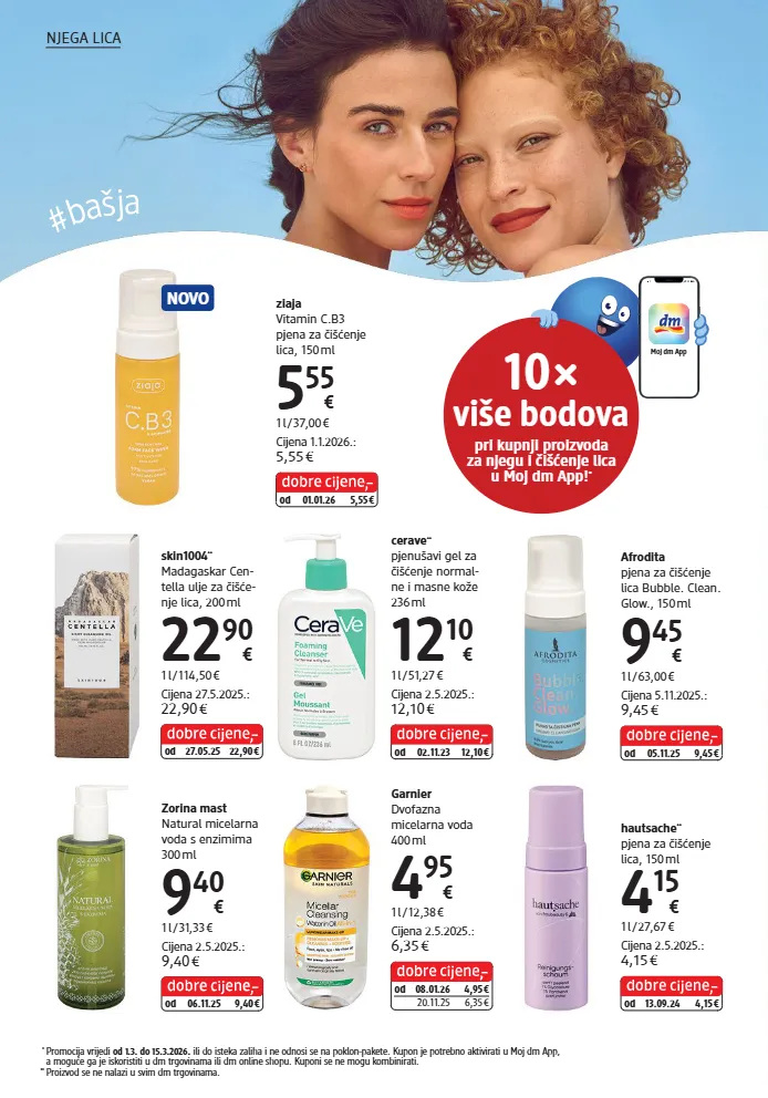 * promocija vrijedi od 1.3. do 15.3.2026. ili do isteka zaliha i ne odnosi se na poklon-pakete. kupon je potrebno aktivirati u moj dm app, a moguće ga je iskoristiti u dm trgovinama ili dm online shopu. kuponi se ne mogu kombinirati. ** proizvod se ne nalazi u svim dm trgovinama. moj dm app 10 × više bodova pri kupnji proizvoda za njegu i čišćenje lica u moj dm app! * afrodita pjena za čišćenje lica bubble. clean. glow., 150 ml 9 45 € 1 l / 63,00 € cijena 5.11.2025.: 9,45 € od 05.11.25 9,45 € garnier dvofazna micelarna voda 400 ml 4 95 € 1 l / 12,38 € cijena 2.5.2025.: 6,35 € od 08.01.26 4,95 € 20.11.25 6,35 € novo ziaja vitamin c.b3 pjena za čišćenje lica, 150 ml 5 55 € 1 l / 37,00 € cijena 1.1.2026.: 5,55 € od 01.01.26 5,55 € zorina mast natural micelarna voda s enzimima 300 ml 9 40 € 1 l / 31,33 € cijena 2.5.2025.: 9,40 € od 06.11.25 9,40 € cerave ** pjenušavi gel za čišćenje normal- ne i masne kože 236 ml 12 10 € 1 l / 51,27 € cijena 2.5.2025.: 12,10 € od 02.11.23 12,10 € skin1004 ** madagaskar cen- tella ulje za čišće- nje lica, 200 ml 22 90 € 1 l / 114,50 € cijena 27.5.2025.: 22,90 € od 27.05.25 22,90 € hautsache ** pjena za čišćenje lica, 150 ml 4 15 € 1 l / 27,67 € cijena 2.5.2025.: 4,15 € od 13.09.24 4,15 € njega lica