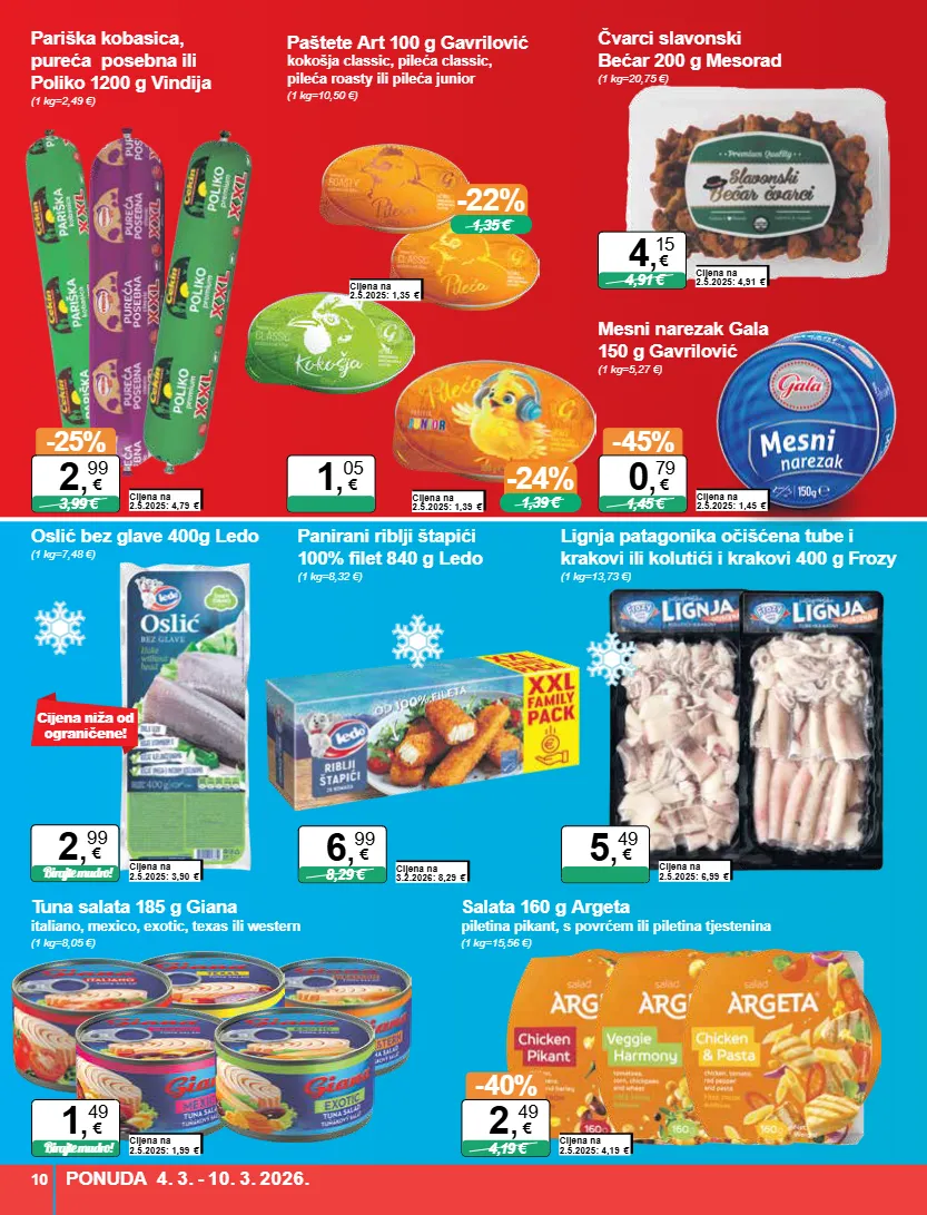 -22% 1,35 € -24% 1,39 € cijena niža od ograničene! oslić bez glave 400g ledo (1 kg=7,48 €) panirani riblji štapići 100% filet 840 g ledo (1 kg=8,32 €) cijena na 3.2.2026: 8,29 € 8,29 € 6 , 99 € lignja patagonika očišćena tube i krakovi ili kolutići i krakovi 400 g frozy (1 kg=13,73 €) cijena na 2.5.2025: 6,99 € 5 , 49 € salata 160 g argeta piletina pikant, s povrćem ili piletina tjestenina (1 kg=15,56 €) cijena na 2.5.2025: 4,19 € -40% 4,19 € 2 , 49 € tuna salata 185 g giana italiano, mexico, exotic, texas ili western (1 kg=8,05 €) cijena na 2.5.2025: 1,99 € birajte mudro! 1 , 49 € cijena na 2.5.2025: 3,90 € birajte mudro! 2 , 99 € mesni narezak gala 150 g gavrilović (1 kg=5,27 €) cijena na 2.5.2025: 1,45 € -45% 1,45 € 0 , 79 € paštete art 100 g gavrilović kokošja classic, pileća classic, pileća roasty ili pileća junior (1 kg=10,50 €) cijena na 2.5.2025: 1,35 € 1 , 05 € cijena na 2.5.2025: 1,39 € pariška kobasica, pureća posebna ili poliko 1200 g vindija (1 kg=2,49 €) cijena na 2.5.2025: 4,79 € -25% 3,99 € 2 , 99 € čvarci slavonski bećar 200 g mesorad (1 kg=20,75 €) cijena na 2.5.2025: 4,91 € 4,91 € 4 , 15 € ponuda 4. 3. - 10. 3. 2026. 10