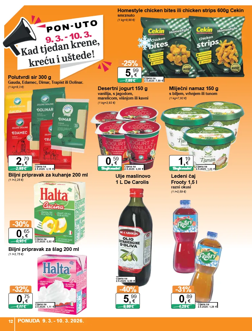 9. 3. - 10. 3. p on - uto homestyle chicken bites ili chicken strips 600g cekin smrznuto (1 kg=9,98 €) cijena na 2.5.2025: 7,99 € -25% 7,99 € 5 , 99 € desertni jogurt 150 g vanilija, s jagodom, marelicom, višnjom ili kavni (1 kg=3,93 €) cijena na 2.5.2025: 0,59 € birajte mudro! 0 , 59 € mliječni namaz 150 g s biljem, vrhnjem ili tunom (1 kg=7,93 €) cijena na 2.5.2025: 1,33 € birajte mudro! 1 , 19 € polutvrdi sir 300 g gauda, edamec, dimar, trapist ili dolinar. (1 kg=9,3 €) cijena na 2.5.2025: 3,19 € 2,99 € 2 , 79 € biljni pripravak za kuhanje 200 ml (1 l=3,25 €) cijena na 2.5.2025: 0,93 € -30% 0,93 € 0 , 65 € biljni pripravak za šlag 200 ml (1 l=3,75 €) cijena na 2.5.2025: 1,11 € -32% 1,11 € 0 , 75 € ulje maslinovo 1 l de carolis cijena na 2.5.2025: 6,99 € -40% 9,99 € 5 , 99 € ledeni čaj frooty 1,5 l razni okusi (1 l=0,59 €) cijena na 2.5.2025: 1,29 € -31% 1,29 € 0 , 89 € 12 ponuda 9. 3. - 10. 3. 2026.