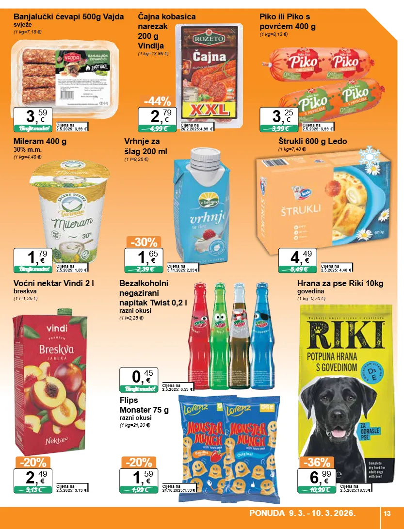 banjalučki ćevapi 500g vajda svježe (1 kg=7,18 €) cijena na 2.5.2025: 3,99 € birajte mudro! 3 , 59 € čajna kobasica narezak 200 g vindija (1 kg=13,95 €) cijena na 26.2.2025:4,99 € -44% 4,99 € 2 , 79 € piko ili piko s povrćem 400 g (1 kg=8,13 €) cijena na 2.5.2025: 3,99 € 3,99 € 3 , 25 € mileram 400 g 30% m.m. (1 kg=4,48 €) cijena na 2.5.2025: 1,89 € birajte mudro! 1 , 79 € vrhnje za šlag 200 ml (1 l=8,25 €) cijena na 3.11.2025:2,39 € -30% 2,39 € 1 , 65 € štrukli 600 g ledo (1 kg=7,48 €) cijena na 2.5.2025: 4,40 € 5,49 € 4 , 49 € bezalkoholni negazirani napitak twist 0,2 l razni okusi (1 l=2,25 €) cijena na 2.5.2025: 0,59 € birajte mudro! 0 , 45 € voćni nektar vindi 2 l breskva (1 l=1,25 €) cijena na 2.5.2025: 3,13 € -20% 3,13 € 2 , 49 € flips monster 75 g razni okusi (1 kg=21,20 €) cijena na 24.10.2025:1,99 € -20% 1,99 € 1 , 59 € hrana za pse riki 10kg govedina (1 kg=0,70 €) cijena na 2.5.2025:10,99 € -36% 10,99 € 6 , 99 € 13 ponuda 9. 3. - 10. 3. 2026.