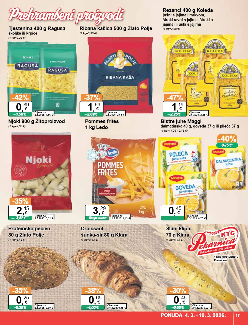 p p ekarnica ekarnica kt ktc c p ekarnica ktc -40% 0,75 € * nije dostupno u daruvaru tjestenina 400 g ragusa školjke ili krpice (1 kg=2,23 €) cijena na 2.5.2025: 1,56 € -42% 1,56 € 0 , 89 € ribana kašica 500 g zlato polje (1 kg=3,38 €) cijena na 2.5.2025: 2,69 € -37% 2,69 € 1 , 69 € rezanci 400 g koleda jušni s jajima i mrkvom, široki ravni s jajima, široki s jajima ili uski s jajima (1 kg=2,98 €) cijena na 2.5.2025: 2,25 € -47% 2,25 € 1 , 19 € bistre juhe maggi dalmatinska 40 g, goveđa 37 g ili pileća 37 g (1 kg=11,25-12,16 €) cijena na 2.5.2025: 0,75 € 0 , 45 € njoki 900 g žitoproizvod (1 kg=2,39 €) cijena na 2.5.2025: 3,32 € -35% 3,32 € 2 , 15 € pommes frites 1 kg ledo proteinsko pecivo 80 g zlato polje (1 kg=3,13 €) cijena na 2.5.2025: 0,39 € -35% 0,39 € 0 , 25 € croissant šunka-sir 80 g klara (1 kg=8,13 €) cijena na 2.5.2025: 0,99 € -38% 1,05 € 0 , 65 € slani klipić 70 g klara (1 kg=6,43 €) cijena na 2.5.2025: 0,62 € -30% 0,65 € 0 , 45 € cijena na 2.5.2025: 4,49 € 3 , 29 € birajte mudro! ponuda 4. 3. - 10. 3. 2026. 17 prehrambeni proizvodi prehrambeni proizvodi