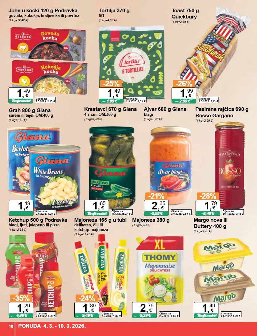 margo nova ili buttery 400 g (1 kg=3,73 €) cijena na 2.5.2025: 1,99 € birajte mudro! 1 , 49 € majoneza 165 g u tubi delikates, čili ili ketchup-majoneza (1 kg=11,45 €) cijena na 2.5.2025: 1,89 € -24% 2,49 € 1 , 89 € juhe u kocki 120 g podravka goveđa, kokošja, kraljevska ili povrtna (1 kg=12,42 €) tortilja 370 g 6/1 (1 kg=4,03 €) cijena na 2.5.2025: 1,99 € -25% 1,99 € 1 , 49 € pasirana rajčica 690 g rosso gargano (1 kg=2,59 €) cijena na 30.1.2026: 2,49 € -28% 2,49 € 1 , 79 € grah 800 g giana šareni ili bijeli om:480 g (1 kg=2,48 €) majoneza 380 g (1 kg=7,34 €) cijena na 2.5.2025: 1,09 € 1 , 19 € krastavci 670 g giana 4-7 cm, om:360 g (1 kg=4,58 €) cijena na 11.12.2025:2,49 € birajte mudro! 1 , 65 € ajvar 680 g giana blagi (1 kg=3,46 €) cijena na 2.5.2025: 2,99 € -21% 2,99 € 2 , 35 € ketchup 500 g podravka blagi, ljuti, jalapeno ili pizza (1 kg=2,58 €) cijena na 2.5.2025: 1,99 € -35% 1,99 € 1 , 29 € toast 750 g quickbury (1 kg=2,65 €) cijena na 2.5.2025: 2,49 € -26% 2,69 € 1 , 99 € cijena na 2.5.2025: 3,39 € 3,39 € 2 , 79 € cijena na 2.5.2025: 2,19 € 1 , 49 € birajte mudro! ponuda 4. 3. - 10. 3. 2026. 18