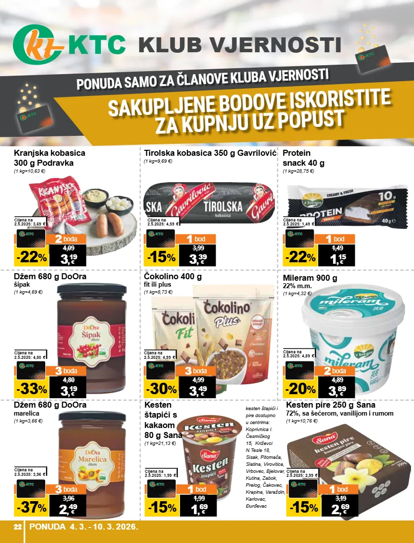ponuda samo za članove kluba vjernosti sakupljene bodove iskoristite za kupnju uz popust klub vjernosti 22 ponuda 17.9. - 23.9.2025. kranjska kobasica 300 g podravka (1 kg=10,63 €) 4,09 3 , 19 - 22 % 2 boda € cijena na 2.5.2025: 3,69 € tirolska kobasica 350 g gavrilović (1 kg=9,69 €) 3,99 3 , 39 - 15 % 1 bod € cijena na 2.5.2025: 4,59 € protein snack 40 g (1 kg=28,75 €) 1,49 1 , 15 - 22 % 1 bod € cijena na 2.5.2025: 1,49 € mileram 900 g 22% m.m. (1 kg=4,32 €) 4,89 3 , 89 - 20 % 2 boda € cijena na 2.5.2025: 4,89 € džem 680 g doora marelica (1 kg=3,66 €) 3,96 2 , 49 - 37 % 3 boda € cijena na 2.5.2025: 3,96 € džem 680 g doora šipak (1 kg=4,69 €) 4,80 3 , 19 - 33 % 3 boda € cijena na 2.5.2025: 4,80 € čokolino 400 g fit ili plus (1 kg=8,73 €) 4,99 3 , 49 - 30 % 3 boda € cijena na 2.5.2025: 4,99 € kesten štapići s kakaom 80 g sana (1 kg=21,13 €) 1,99 1 , 69 - 15 % 1 bod € cijena na 2.5.2025: 1,99 € kesten pire 250 g sana 72%, sa šećerom, vanilijom i rumom (1 kg=10,76 €) 3,19 2 , 69 - 15 % 1 bod € cijena na 2.5.2025: 2,99 € kesten štapići i pire dostupno u centrima: koprivnica i. česmičkog 15, križevci n.tesle 18, sisak, pitomača, slatina, virovitica, vrbovec, bjelovar, kutina, zabok, prelog, čakovec, krapina, varaždin, karlovac, đurđevac ponuda 4. 3. - 10. 3. 2026. 22