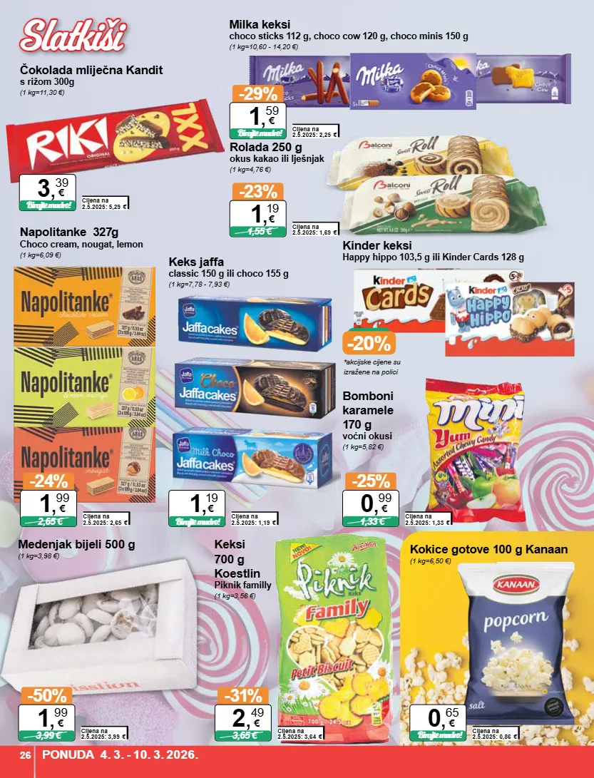 *akcijske cijene su izražene na polici -20% keks jaffa classic 150 g ili choco 155 g (1 kg=7,78 - 7,93 €) kinder keksi happy hippo 103,5 g ili kinder cards 128 g bomboni karamele 170 g voćni okusi (1 kg=5,82 €) cijena na 2.5.2025: 1,33 € -25% 1,33 € 0 , 99 € milka keksi choco sticks 112 g, choco cow 120 g, choco minis 150 g (1 kg=10,60 - 14,20 €) cijena na 2.5.2025: 2,25 € -29% birajte mudro! 1 , 59 € čokolada mliječna kandit s rižom 300g (1 kg=11,30 €) cijena na 2.5.2025: 5,29 € birajte mudro! 3 , 39 € kokice gotove 100 g kanaan (1 kg=6,50 €) cijena na 2.5.2025: 0,86 € birajte mudro! 0 , 65 € keksi 700 g koestlin piknik familly (1 kg=3,56 €) cijena na 2.5.2025: 3,64 € -31% 3,65 € 2 , 49 € medenjak bijeli 500 g (1 kg=3,98 €) cijena na 2.5.2025: 3,99 € -50% 3,99 € 1 , 99 € rolada 250 g okus kakao ili lješnjak (1 kg=4,76 €) cijena na 2.5.2025: 1,69 € -23% 1,55 € 1 , 19 € napolitanke 327g choco cream, nougat, lemon (1 kg=6,09 €) cijena na 2.5.2025: 2,65 € -24% 2,65 € 1 , 99 € cijena na 2.5.2025: 1,19 € 1 , 19 € birajte mudro! ponuda 4. 3. - 10. 3. 2026. 26 slatkiši slatkiši