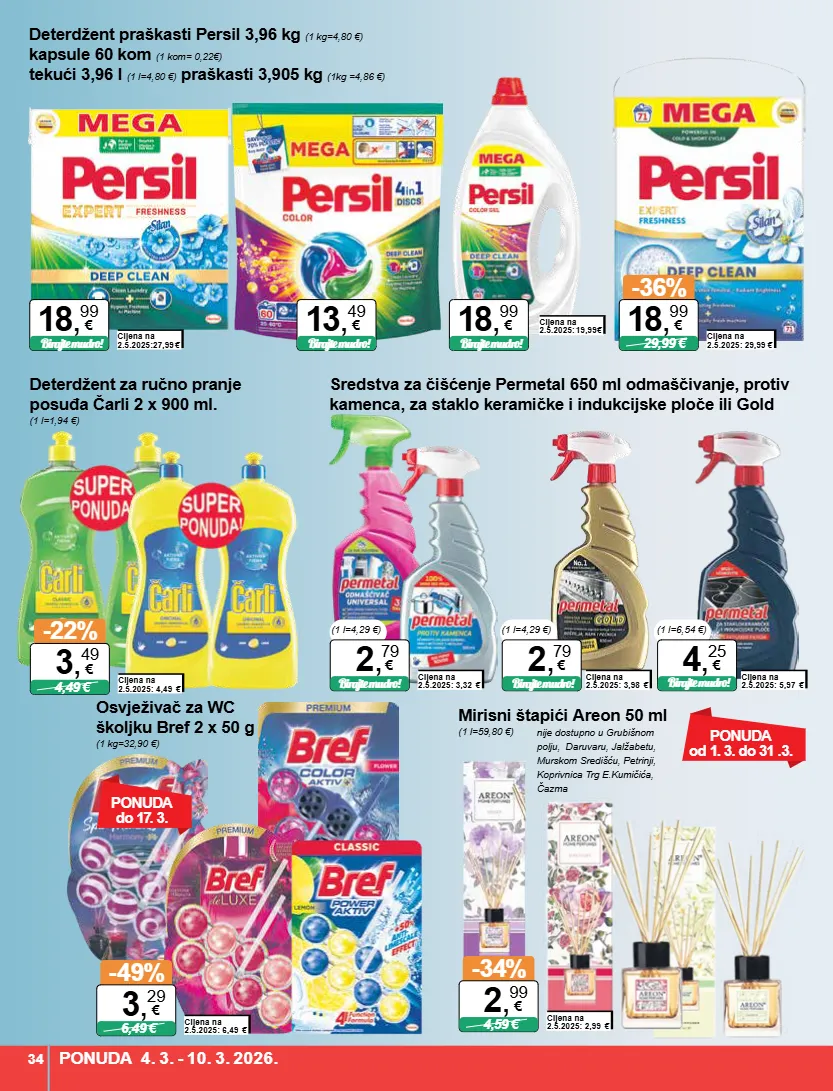 deterdžent praškasti persil 3,96 kg (1 kg=4,80 €) kapsule 60 kom (1 kom= 0,22€) tekući 3,96 l (1 l=4,80 €) praškasti 3,905 kg (1kg =4,86 €) cijena na 2.5.2025:27,99 € birajte mudro! 18 , 99 € cijena na 2.5.2025: 19,99 € birajte mudro! 13 , 49 € birajte mudro! 18 , 99 € cijena na 2.5.2025: 29,99 € -36% 29,99 € 18 , 99 € mirisni štapići areon 50 ml (1 l=59,80 €) cijena na 2.5.2025: 2,99 € -34% 4,59 € 2 , 99 € ponuda od 1. 3. do 31 .3. nije dostupno u grubišnom polju, daruvaru, jalžabetu, murskom središću, petrinji, koprivnica trg e.kumičića, čazma deterdžent za ručno pranje posuđa čarli 2 x 900 ml. (1 l=1,94 €) cijena na 2.5.2025: 4,49 € -22% 4,49 € 3 , 49 € sredstva za čišćenje permetal 650 ml odmaščivanje, protiv kamenca, za staklo keramičke i indukcijske ploče ili gold cijena na 2.5.2025: 3,32 € 2 , 79 € (1 l=4,29 €) birajte mudro! cijena na 2.5.2025: 3,98 € (1 l=4,29 €) 2 , 79 € birajte mudro! cijena na 2.5.2025: 5,97 € (1 l=6,54 €) 4 , 25 € birajte mudro! osvježivač za wc školjku bref 2 x 50 g (1 kg=32,90 €) cijena na 2.5.2025: 6,49 € -49% 6,49 € 3 , 29 € ponuda do 17. 3. ponuda 4. 3. - 10. 3. 2026. 34