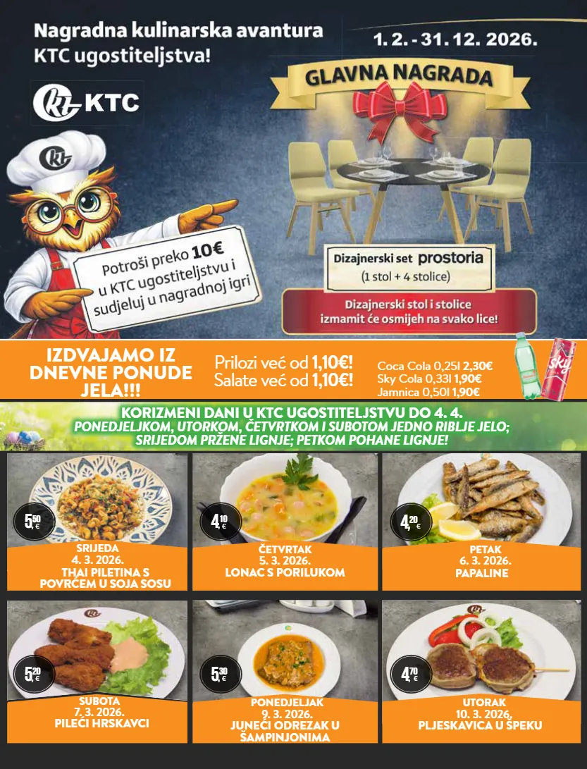 četvrtak 5. 3. 2026. zelena tjestenina s plodovima mora utorak 10. 3. 2026. ponedjeljak 9. 3. 2026. subota 7. 3. 2026. juneći odrezak u šampinjonima pljeskavica u špeku pileći hrskavci izdvajamo iz dnevne ponude jela!!! petak 6. 3. 2026. papaline 5 , 50 € 4 , 10 € 5 , 20 € 4, 20 € 4 , 70 € srijeda 4. 3. 2026. lonac s porilukom thai piletina s povrćem u soja sosu coca cola 0,25l 2,30€ sky cola 0,33l 1,90€ jamnica 0,50l 1,90€ prilozi već od 1,10€! salate već od 1,10€! 5 , 30 € korizmeni dani u ktc ugostiteljstvu do 4. 4. ponedjeljkom, utorkom, četvrtkom i subotom jedno riblje jelo; srijedom pržene lignje; petkom pohane lignje!