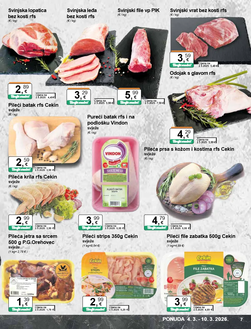 svinjska leđa bez kosti rfs (€ / kg) svinjski file vp pik (€ / kg) cijena na 2.5.2025: 5,99 € birajte mudro! 3 , 29 € cijena na 2.5.2025: 7,59 € birajte mudro! 5 , 99 € svinjska lopatica bez kosti rfs (€ / kg) svinjski vrat bez kosti rfs (€ / kg) cijena na 2.5.2025: 4,49 € birajte mudro! 2 , 89 € cijena na 2.5.2025: 5,49 € birajte mudro! 3 , 59 € odojak s glavom rfs (€ / kg) cijena na 2.5.2025: 5,99 € birajte mudro! 4 , 29 € pileća prsa s kožom i kostima rfs cekin svježe (€ / kg) cijena na 2.5.2025: 5,99 € birajte mudro! 4 , 79 € pileća krila rfs cekin svježe (€ / kg) cijena na 2.5.2025: 3,99 € birajte mudro! 2 , 99 € pileći batak rfs cekin svježe (€ / kg) cijena na 2.5.2025: 3,99 € birajte mudro! 2 , 59 € pileći strips 350g cekin svježe (1 kg=8,54 €) cijena na 2.5.2025: 5,29 € birajte mudro! 2 , 99 € pileći file zabatka 500g cekin svježe (1 kg=4,89 €) cijena na 2.5.2025: 4,89 € birajte mudro! 3 , 99 € pureći batak rfs i na podlošku vindon svježe (€ / kg) cijena na 2.5.2025: 5,59 € birajte mudro! 3 , 99 € pileća jetra sa srcem 500 g p.g.orehovec svježe (1 kg= 2,78 € ) cijena na 2.5.2025: 1,79 € birajte mudro! 1 , 39 € ponuda 4. 3. - 10. 3. 2026. 7
