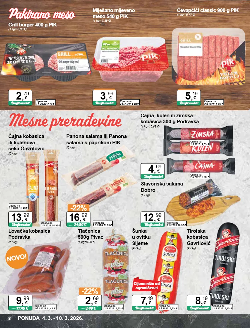 novo! čajna kobasica ili kulenova seka gavrilović (€ / kg) cijena na 2.5.2025:19,49 € birajte mudro! 13 , 99 € cijena na 2.5.2025:18,99 € panona salama ili panona salama s paprikom pik (€ / kg) cijena na 2.5.2025:21,89 € -22% 21,89 € 16 , 99 € čajna, kulen ili zimska kobasica 300 g podravka (1 kg=15,63 €) cijena na 2.5.2025: 6,99 € birajte mudro! 4 , 69 € cijena na 2.5.2025: 5,99 € slavonska salama dobro (€ / kg) cijena na 2.5.2025:16,99 € birajte mudro! 12 , 99 € tirolska kobasica gavrilović (€ / kg) cijena na 2.5.2025: 8,19 € birajte mudro! 8 , 19 € tlačenica 500g pivac (1 kg=5,38 €) cijena na 2.5.2025: 3,55 € -22% 3,49 € 2 , 69 € lovačka kobasica podravka (€ / kg) cijena na 10.2.2026:11,49 € 11,49 € 9 , 99 € šunka u ovitku sljeme (€ / kg) cijena na 2.5.2025: 8,79 € birajte mudro! 7 , 49 € cijena niža od ograničene! miješano mljeveno meso 540 g pik (1 kg= 7,39 €) grill burger 400 g pik (1 kg= 6,98 €) ćevapčići classic 900 g pik (1 kg= 5,77 €) cijena na 2.5.2025: 4,49 € birajte mudro! 3 , 99 € cijena na 2.5.2025: 2,79 € birajte mudro! 2 , 79 € cijena na 2.5.2025: 5,99 € birajte mudro! 5 , 19 € ponuda 4. 3. - 10. 3. 2026. 8 mesne prerađevine pakirano meso pakirano meso