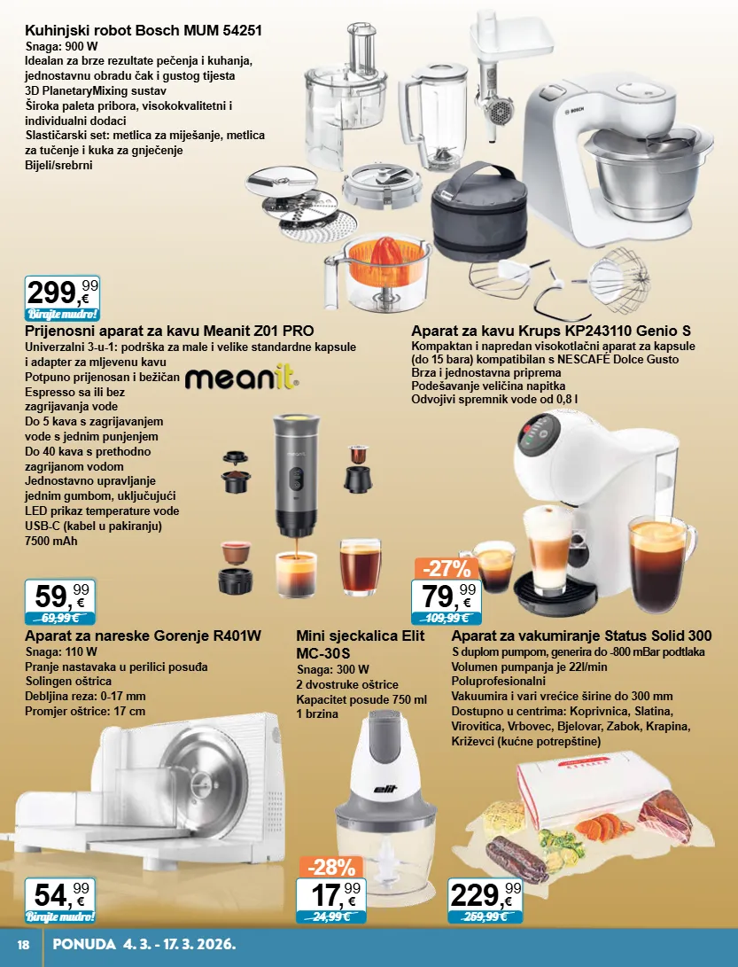-28% 24,99 € 17 , 99 € 54 , 99 € birajte mudro! 59 , 99 € 69,99 € -27% 109,99 € 79 , 99 € 259,99 € 229 , 99 € birajte mudro! 299 , 99 € 18 ponuda 4. 3. - 17. 3. 2026. mini sjeckalica elit mc-30s snaga: 300 w 2 dvostruke oštrice kapacitet posude 750 ml 1 brzina aparat za nareske gorenje r401w snaga: 110 w pranje nastavaka u perilici posuđa solingen oštrica debljina reza: 0-17 mm promjer oštrice: 17 cm prijenosni aparat za kavu meanit z01 pro univerzalni 3-u-1: podrška za male i velike standardne kapsule i adapter za mljevenu kavu potpuno prijenosan i bežičan espresso sa ili bez zagrijavanja vode do 5 kava s zagrijavanjem vode s jednim punjenjem do 40 kava s prethodno zagrijanom vodom jednostavno upravljanje jednim gumbom, uključujući led prikaz temperature vode usb-c (kabel u pakiranju) 7500 mah aparat za kavu krups kp243110 genio s kompaktan i napredan visokotlačni aparat za kapsule (do 15 bara) kompatibilan s nescafé dolce gusto brza i jednostavna priprema podešavanje veličina napitka odvojivi spremnik vode od 0,8 l aparat za vakumiranje status solid 300 s duplom pumpom, generira do -800 mbar podtlaka volumen pumpanja je 22l/min poluprofesionalni vakuumira i vari vrećice širine do 300 mm dostupno u centrima: koprivnica, slatina, virovitica, vrbovec, bjelovar, zabok, krapina, križevci (kućne potrepštine) kuhinjski robot bosch mum 54251 snaga: 900 w idealan za brze rezultate pečenja i kuhanja, jednostavnu obradu čak i gustog tijesta 3d planetarymixing sustav široka paleta pribora, visokokvalitetni i individualni dodaci slastičarski set: metlica za miješanje, metlica za tučenje i kuka za gnječenje bijeli/srebrni