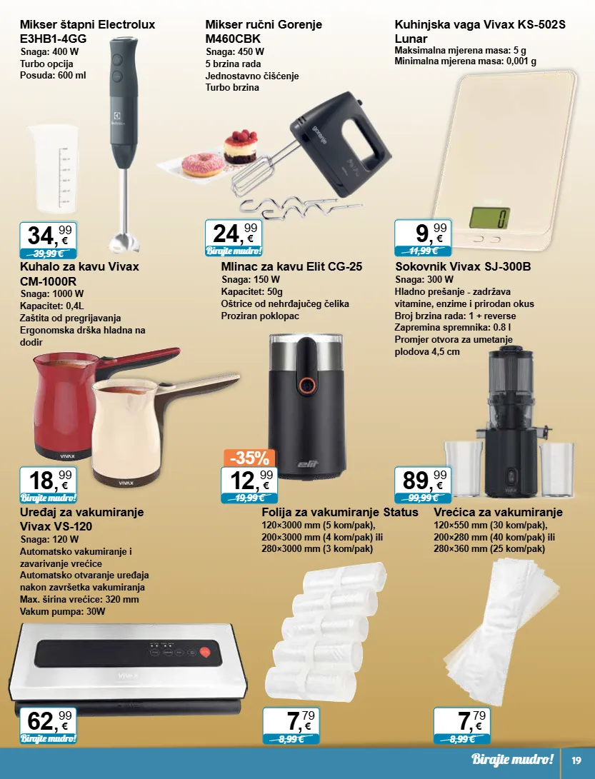 -35% 19,99 € 12 , 99 € 24 , 99 € birajte mudro! 9 , 99 € 11,99 € 89 , 99 € 99,99 € 18 , 99 € birajte mudro! 62 , 99 € birajte mudro! 34 , 99 € 39,99 € 7 , 79 € 8,99 € 7 , 79 € 8,99 € birajte mudro! 19 mlinac za kavu elit cg-25 snaga: 150 w kapacitet: 50g oštrice od nehrđajučeg čelika proziran poklopac mikser ručni gorenje m460cbk snaga: 450 w 5 brzina rada jednostavno čišćenje turbo brzina kuhinjska vaga vivax ks-502s lunar maksimalna mjerena masa: 5 g minimalna mjerena masa: 0,001 g sokovnik vivax sj-300b snaga: 300 w hladno prešanje - zadržava vitamine, enzime i prirodan okus broj brzina rada: 1 + reverse zapremina spremnika: 0.8 l promjer otvora za umetanje plodova 4,5 cm kuhalo za kavu vivax cm-1000r snaga: 1000 w kapacitet: 0,4l zaštita od pregrijavanja ergonomska drška hladna na dodir uređaj za vakumiranje vivax vs-120 snaga: 120 w automatsko vakumiranje i zavarivanje vrećice automatsko otvaranje uređaja nakon završetka vakumiranja max. širina vrećice: 320 mm vakum pumpa: 30w mikser štapni electrolux e3hb1-4gg snaga: 400 w turbo opcija posuda: 600 ml folija za vakumiranje status 120×3000 mm (5 kom/pak), 200×3000 mm (4 kom/pak) ili 280×3000 mm (3 kom/pak) vrećica za vakumiranje 120×550 mm (30 kom/pak), 200×280 mm (40 kom/pak) ili 280×360 mm (25 kom/pak)