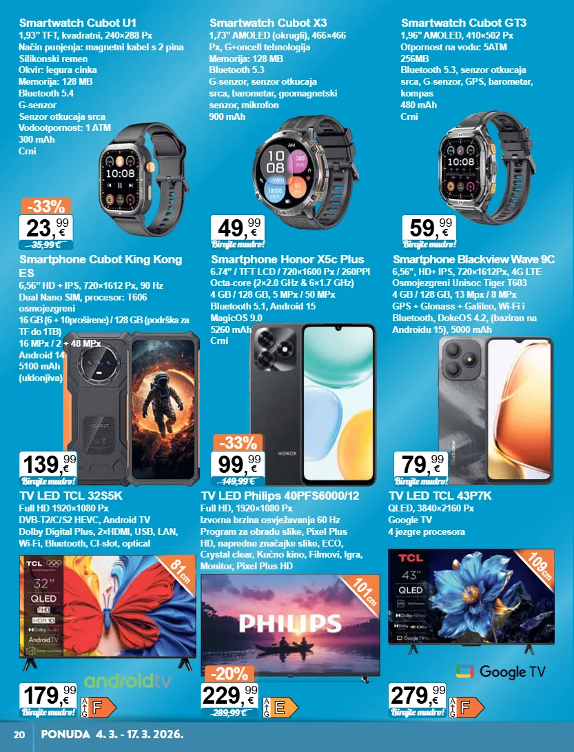 -33% 35,99 € 23 , 99 € 49 , 99 € birajte mudro! 59 , 99 € birajte mudro! birajte mudro! 139 , 99 € 79 , 99 € birajte mudro! -33% 149,99 € 99 , 99 € -20% 289,99 € 229 , 99 € birajte mudro! 179 , 99 € birajte mudro! 279 , 99 € 20 ponuda 4. 3. - 17. 3. 2026. smartwatch cubot u1 1,93’’ tft, kvadratni, 240×288 px način punjenja: magnetni kabel s 2 pina silikonski remen okvir: legura cinka memorija: 128 mb bluetooth 5.4 g-senzor senzor otkucaja srca vodootpornost: 1 atm 300 mah crni smartwatch cubot x3 1,73” amoled (okrugli), 466×466 px, g+oncell tehnologija memorija: 128 mb bluetooth 5.3 g-senzor, senzor otkucaja srca, barometar, geomagnetski senzor, mikrofon 900 mah smartwatch cubot gt3 1,96’’ amoled, 410×502 px otpornost na vodu: 5atm 256mb bluetooth 5.3, senzor otkucaja srca, g-senzor, gps, barometar, kompas 480 mah crni smartphone cubot king kong es 6,56’’ hd + ips, 720×1612 px, 90 hz dual nano sim, procesor: t606 osmojezgreni 16 gb (6 + 10proširene) / 128 gb (podrška za tf do 1tb) 16 mpx / 2 + 48 mpx android 14 5100 mah (uklonjiva) smartphone blackview wave 9c 6,56”, hd+ ips, 720×1612px, 4g lte osmojezgreni unisoc tiger t603 4 gb / 128 gb, 13 mpx / 8 mpx gps + glonass + galileo, wi-fi i bluetooth, dokeos 4.2, (baziran na androidu 15), 5000 mah smartphone honor x5c plus 6.74” / tft lcd / 720×1600 px / 260ppi octa-core (2×2.0 ghz & 6×1.7 ghz) 4 gb / 128 gb, 5 mpx / 50 mpx bluetooth 5.1, android 15 magicos 9.0 5260 mah crni 109 cm 81 cm 101 cm tv led philips 40pfs6000/12 full hd, 1920×1080 px izvorna brzina osvježavanja 60 hz program za obradu slike, pixel plus hd, napredne značajke slike, eco, crystal clear, kućno kino, filmovi, igra, monitor, pixel plus hd tv led tcl 32s5k full hd 1920×1080 px dvb-t2/c/s2 hevc, android tv dolby digital plus, 2×hdmi, usb, lan, wi-fi, bluetooth, ci-slot, optical tv led tcl 43p7k qled, 3840×2160 px google tv 4 jezgre procesora