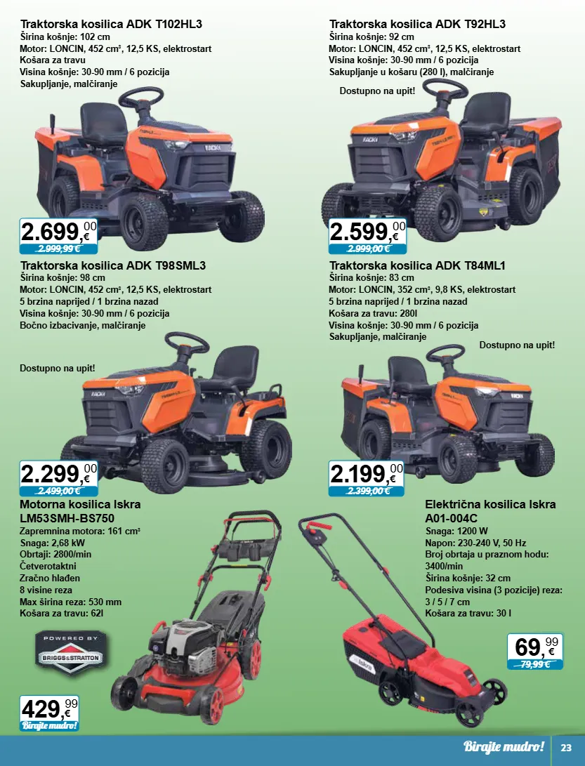 2.999,99 € 2.699 , 00 € 2.399,00 € 2.199 , 00 € 2.499,00 € 2.299 , 00 € 2.999,00 € 2.599 , 00 € birajte mudro! 429 , 99 € 69 , 99 € 79,99 € birajte mudro! 23 traktorska kosilica adk t102hl3 širina košnje: 102 cm motor: loncin, 452 cm 3 , 12,5 ks, elektrostart košara za travu visina košnje: 30-90 mm / 6 pozicija sakupljanje, malčiranje traktorska kosilica adk t84ml1 širina košnje: 83 cm motor: loncin, 352 cm 3 , 9,8 ks, elektrostart 5 brzina naprijed / 1 brzina nazad košara za travu: 280l visina košnje: 30-90 mm / 6 pozicija sakupljanje, malčiranje dostupno na upit! traktorska kosilica adk t98sml3 širina košnje: 98 cm motor: loncin, 452 cm 3 , 12,5 ks, elektrostart 5 brzina naprijed / 1 brzina nazad visina košnje: 30-90 mm / 6 pozicija bočno izbacivanje, malčiranje traktorska kosilica adk t92hl3 širina košnje: 92 cm motor: loncin, 452 cm 3 , 12,5 ks, elektrostart visina košnje: 30-90 mm / 6 pozicija sakupljanje u košaru (280 l), malčiranje dostupno na upit! dostupno na upit! motorna kosilica iskra lm53smh-bs750 zapremnina motora: 161 cm 3 snaga: 2,68 kw obrtaji: 2800/min četverotaktni zračno hlađen 8 visine reza max širina reza: 530 mm košara za travu: 62l električna kosilica iskra a01-004c snaga: 1200 w napon: 230-240 v, 50 hz broj obrtaja u praznom hodu: 3400/min širina košnje: 32 cm podesiva visina (3 pozicije) reza: 3 / 5 / 7 cm košara za travu: 30 l