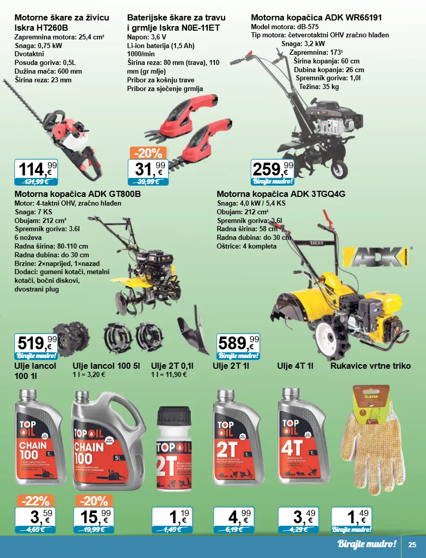 131,99 € 114 , 99 € -20% 39,99 € 31 , 99 € birajte mudro! 259 , 99 € birajte mudro! 519 , 99 € birajte mudro! 589 , 99 € -22% 4,65 € 3 , 59 € -20% 19,99 € 15 , 99 € 1 , 19 € 1,45 € 4 , 99 € 6,19 € 3 , 49 € 4,29 € 1 , 49 € birajte mudro! birajte mudro! 25 motorne škare za živicu iskra ht260b zapremnina motora: 25,4 cm 3 snaga: 0,75 kw dvotaktni posuda goriva: 0,5l dužina mača: 600 mm širina reza: 23 mm baterijske škare za travu i grmlje iskra n0e-11et napon: 3,6 v li-ion baterija (1,5 ah) 1000/min širina reza: 80 mm (trava), 110 mm (gr mlje) pribor za košnju trave pribor za sječenje grmlja motorna kopačica adk wr65191 model motora: db-575 tip motora: četverotaktni ohv zračno hlađen snaga: 3,2 kw zapremnina: 173 3 širina kopanja: 60 cm dubina kopanja: 26 cm spremnik goriva: 1,0l težina: 35 kg motorna kopačica adk gt800b motor: 4-taktni ohv, zračno hlađen snaga: 7 ks obujam: 212 cm 3 spremnik goriva: 3.6l 6 noževa radna širina: 80-110 cm radna dubina: do 30 cm brzine: 2×naprijed, 1×nazad dodaci: gumeni kotači, metalni kotači, bočni diskovi, dvostrani plug motorna kopačica adk 3tgq4g snaga: 4,0 kw / 5,4 ks obujam: 212 cm 3 spremnik goriva: 3,6l radna širina: 58 cm radna dubina: do 30 cm oštrice: 4 kompleta ulje lancol 100 1l ulje lancol 100 5l 1 l = 3,20 € ulje 2t 0,1l 1 l = 11,90 € ulje 2t 1l ulje 4t 1l rukavice vrtne triko