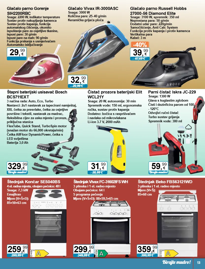 31 , 99 € 38,99 € birajte mudro! 329 , 99 € 59 , 99 € birajte mudro! -40% 67,69 € 39 , 99 € 29 , 99 € 32 , 99 € 39,99 € 349,99 € 299 , 99 € 299,99 € 259 , 99 € 399,99 € 359 , 99 € birajte mudro! 13 čistač prozora baterijski elit wcl21y snaga: 20 w, autonomija: 30 min spremnik vode: 150 ml, ergonomska ručka, sustav protiv kapanja dodatno: bočica s raspršivačem i navlaka od mikrovlakana li-ion 3.7 v, 2000 mah štapni baterijski usisavač bosch bcs711ext 3 načina rada: auto, eco, turbo nastavci: 2u1 nastavak za tapecirani namještaj, xxl četka za presvlake, četka za osjetjive površine i tekstil, nastavak za madrac, fleksibilna cijev za uska mjesta i proreze, priključna stanica flextube, quick stand, turbospin motor (snažan motor do 66,000 okretaja/min) četka allfloor dynamicpower, četka s led svijetlima baterija 3,0 ah parni čistač iskra jc-229 snaga: 1300 w glava s kuglastim zglobom čisti i dezinficira parom od 100 - 120°c odvojivi ručni čistač turbo sustav grijanja spremnik vode: 380 ml glačalo parno russell hobbs 27000-56 diamond elite snaga: 3100 w, spremnik: 350 ml neprestana para: 50 g/min dodatni udar pare: 220g/min samočišćenje, anti calc system funkcija protiv kapanja i protiv kamenca vertikalna para kabel: 3 m glačalo parno gorenje sih2200rbc snaga: 2200 w, indikator temperature sustav protiv nakupljanja kamenca sustav protiv kapanja, funkcija automatskog čišćenja, okomito ispuštanje pare za osjetljive tkanine, ispust pare: 30 g/min ispust pare na mah: 90 g/min funkcija prskanja s usmjerivačem automatsko isključivanje glačalo vivax ir-3000asc snaga: 3000 w količina pare: 25-40 g/min keramička grijaća ploča štednjak vivax fc-31602ifs wh 3 plinska i 1 el. radno mjesto obujam pećnice: 64 l 5 programa pečenja mjere (vך×d): 88×59,5×65 cm štednjak končar se5040bs 4 el. radna mjesta, obujam pećnice: 48 l snaga: 7,3 kw emajliran mjere (vך×d): 85×50×63 cm štednjak beko fbs63121wd 3 plinska i 1 el. radno mjesto mjere (vך): 85×60 cm