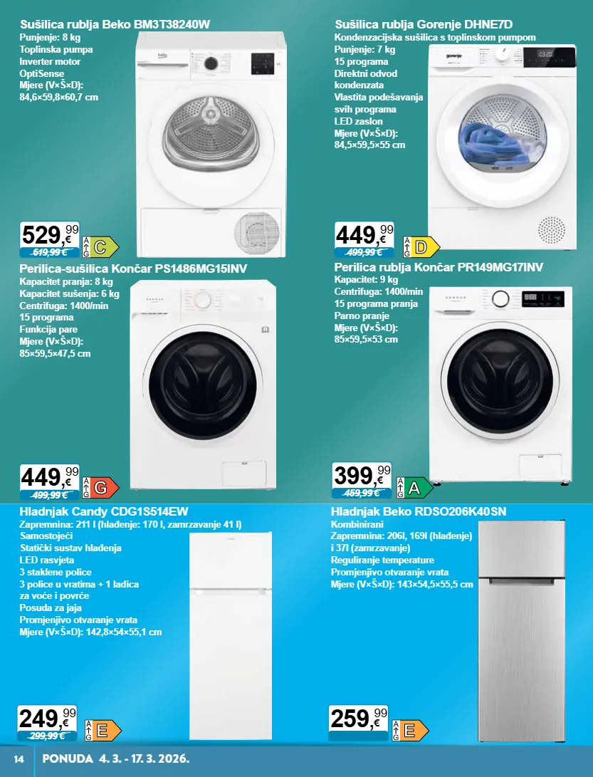 499,99 € 449 , 99 € 459,99 € 399 , 99 € 499,99 € 449 , 99 € 299,99 € 249 , 99 € 259 , 99 € 619,99 € 529 , 99 € 14 ponuda4. 3.-17.3.2026. sušilica rublja gorenje dhne7d kondenzacijska sušilica s toplinskom pumpom punjenje: 7 kg 15 programa direktni odvod kondenzata vlastita podešavanja svih programa led zaslon mjere (vך×d): 84,5×59,5×55 cm perilica rublja končar pr149mg17inv kapacitet: 9 kg centrifuga: 1400/min 15 programa pranja parno pranje mjere (vך×d): 85×59,5×53 cm perilica-sušilica končar ps1486mg15inv kapacitet pranja: 8 kg kapacitet sušenja: 6 kg centrifuga: 1400/min 15 programa funkcija pare mjere (vך×d): 85×59,5×47,5 cm hladnjak candy cdg1s514ew zapremnina: 211 l (hlađenje: 170 l, zamrzavanje 41 l) samostojeći statički sustav hlađenja led rasvjeta 3 staklene police 3 police u vratima + 1 ladica za voće i povrće posuda za jaja promjenjivo otvaranje vrata mjere (vך×d): 142,8×54×55,1 cm hladnjak beko rdso206k40sn kombinirani zapremnina: 206l, 169l (hlađenje) i 37l (zamrzavanje) reguliranje temperature promjenjivo otvaranje vrata mjere (vך×d): 143×54,5×55,5 cm sušilica rublja beko bm3t38240w punjenje: 8 kg toplinska pumpa inverter motor optisense mjere (vך×d): 84,6×59,8×60,7 cm