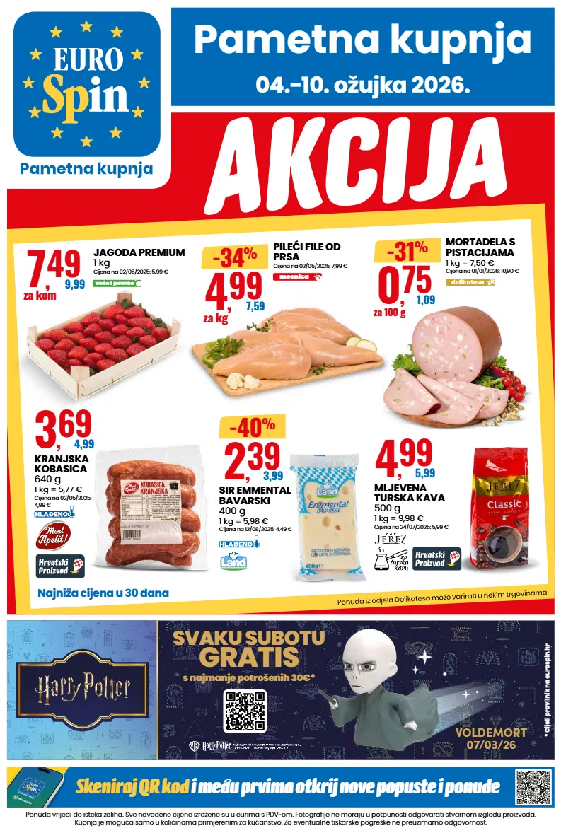 04.-10. ožujka 2026. pametna kupnja * cijeli pravilnik na eurospin.hr s najmanje potrošenih 30€* svaku subotu gratis voldemort 07/03/26 ponuda vrijedi do isteka zaliha. sve navedene cijene izražene su u eurima s pdv-om. fotografije ne moraju u potpunosti odgovarati stvarnom izgledu proizvoda. kupnja je moguća samo u količinama primjerenim za kućanstvo. za eventualne tiskarske pogreške ne preuzimamo odgovornost. skeniraj qr kod i među prvima otkrij nove popuste i ponude najniža cijena u 30 dana kranjska kobasica 640 g 1 kg = 5,77 € cijena na 02/05/2025: 4,99 € 3 , 69 4,99 sir emmental bavarski 400 g 1 kg = 5,98 € cijena na 12/08/2025: 4,49 € 2 , 39 3,99 -40 % mljevena turska kava 500 g 1 kg = 9,98 € cijena na 24/07/2025: 5,99 € 4 , 99 5,99 mortadela s pistacijama 1 kg = 7,50 € cijena na 01/01/2026: 10,90 € 0 , 75 1,09 za 100 g -31 % jagoda premium 1 kg cijena na 02/05/2025: 5,99 € 7 , 49 9,99 za kom voće i povrće pileći file od prsa cijena na 02/05/2025: 7,99 € 4 , 99 7,59 za kg mesnica -34 %