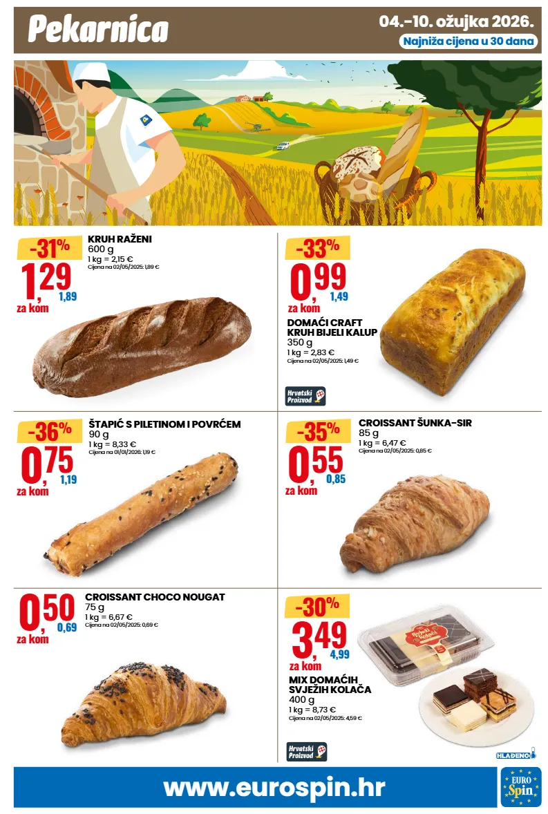 www.eurospin.hr pekarnica 04.-10. ožujka 2026. najniža cijena u 30 dana kruh raženi 600 g 1 kg = 2,15 € cijena na 02/05/2025: 1,89 € 1 , 29 1,89 za kom štapić s piletinom i povrćem 90 g 1 kg = 8,33 € cijena na 01/01/2026: 1,19 € 0 , 75 1,19 za kom croissant šunka-sir 85 g 1 kg = 6,47 € cijena na 02/05/2025: 0,85 € 0 , 55 0,85 za kom croissant choco nougat 75 g 1 kg = 6,67 € cijena na 02/05/2025: 0,69 € 0 , 50 0,69 za kom -31 % mix domaćih svježih kolača 400 g 1 kg = 8,73 € cijena na 02/05/2025: 4,59 € 3 , 49 4,99 za kom -30 % domaći craft kruh bijeli kalup 350 g 1 kg = 2,83 € cijena na 02/05/2025: 1,49 € 0 , 99 1,49 za kom -33 % -36 % -35 %
