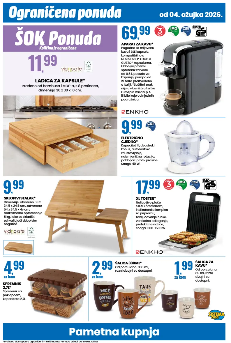 pametna kupnja ograničena ponuda *proizvod dostupan u ograničenim količinama. ponuda vrijedi do isteka zaliha. od 04. ožujka 2026. sklopivi stalak* dimenzije: otvoreno 59 x 34,5 x 24,5 cm, zatvoreno 54 x 34,5 x 4v cm, maksimalno opterećenje 5 kg, lako se skladišti zahvaljujući sklopivim nogama. 9 , 99 aparat za kavu* pogodno za mljevenu kavu i ese kapsule, kompatibilno s nespresso* i dolce gusto* kapsulama. uklonjivi prozirni spremnik za vodu od 0,6 l, posuda za kapanje, pumpa od 19 bara proizvedeno u italiji. *zaštitni znak nije u vlasništvu tvrtke eurospin italia s.p.a. ili bilo koje od njezinih podružnica. 69 , 99 električno cjedilo* kapacitet 1 l, dvostruki konus, automatsko zaustavljanje, naizmjenična rotacija, poklopac protiv prašine. snaga 40 w. 9 , 99 xl toster* neljepljive ploče s ilag premazom, indikatorska lampica za pripremu, zaključavanje ručke, vertikalno odlaganje, protuklizne nožice, snaga 1300-1500 w. 17 , 99 spremnik 2,7l* spremnik sa poklopcem, kapaciteta 2,7l. 4 , 99 za kom šalica za kavu* od porculana. 80 ml, razni dizajni su dostupni. 1 , 99 za kom šalica 330ml* od porculana. 330 ml, razni dizajni su dostupni. 2 , 99 za kom ladica za kapsule* izrađeno od bambusa i mdf-a, s 8 pretinaca, dimenzija 30 x 30 x 10 cm. 11 , 99