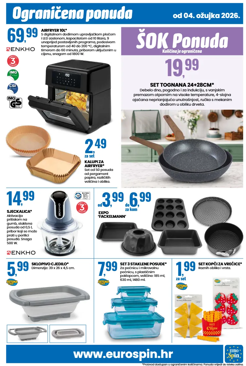 www.eurospin.hr ograničena ponuda *proizvod dostupan u ograničenim količinama. ponuda vrijedi do isteka zaliha. od 04. ožujka 2026. set tognana 24+28cm* debelo dno, pogodno i za indukciju, s vanjskim premazom otpornim na visoke temperature, 4-slojna ojačana neprianjajuća unutrašnjost, ručka s mekanim dodirom u obliku drveta. 19 , 99 airfryer 10l* s digitalnom dodirnom upravljačkom pločom i led zaslonom, kapacitetom od 10 litara, 9 unaprijed postavljenih programa, podesivom temperaturom od 40 do 200 °c, digitalnim timerom do 60 minuta, priborom uključenim u cijenu, snagom od 1800 w. 69 , 99 kalupi za airfryer* set od 50 posuda od pergament papira, različitih veličina i oblika. 2 , 49 za set sjeckalica* aktivacija pritiskom na gumb, staklena posuda od 0,5 l, pribor koji se može prati u perilici posuđa. snaga 500 w. 14 , 99 sklopivo cjedilo* dimenzije: 39 x 26 x 4,5 cm. 5 , 99 set 3 staklene posude* za pećnicu i mikrovalnu pećnicu, s plastičnim poklopcem, veličine: 185 ml, 630 ml, 1480 ml. 7 , 99 set kopči za vrećice* raznih oblika i vrsta. 1 , 99 za set expo ‘fackelmann’ od 3 , 99 do 6 , 99 za kom