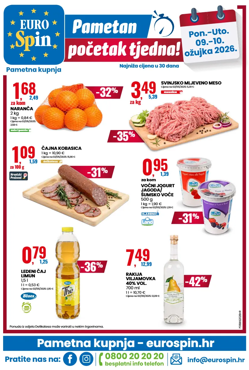 pametna kupnja - eurospin.hr pratite nas na: pon.-uto. 09.-10. ožujka 2026. najniža cijena u 30 dana p06bis2026hr ponuda iz odjela delikatesa može varirati u nekim trgovinama. 7 , 49 12,99 -42 % rakija viljamovka 40% vol. 700 ml 1 l = 10,70 € cijena na 02/05/2025: 12,09 € 0 , 95 1,39 za kom voćni jogurt jagoda/ šumsko voće 500 g 1 kg = 1,90 € cijena na 02/05/2025: 1,39 € -31 % 0 , 79 1,25 40% recycled plastic -36 % ledeni čaj limun 1,5 l 1 l = 0,53 € cijena na 02/05/2025: 1,05 € -31 % čajna kobasica 1 kg = 10,90 € cijena na 02/05/2025: 15,90 € 1 , 09 1,59 za 100 g naranča 2 kg 1 kg = 0,84 € cijena na 02/05/2025: 2,58 € -32 % 1 , 68 2,49 za kom voće i povrće -35 % svinjsko mljeveno meso cijena na 02/05/2025: 5,39 € 3 , 49 5,39 za kg mesnica