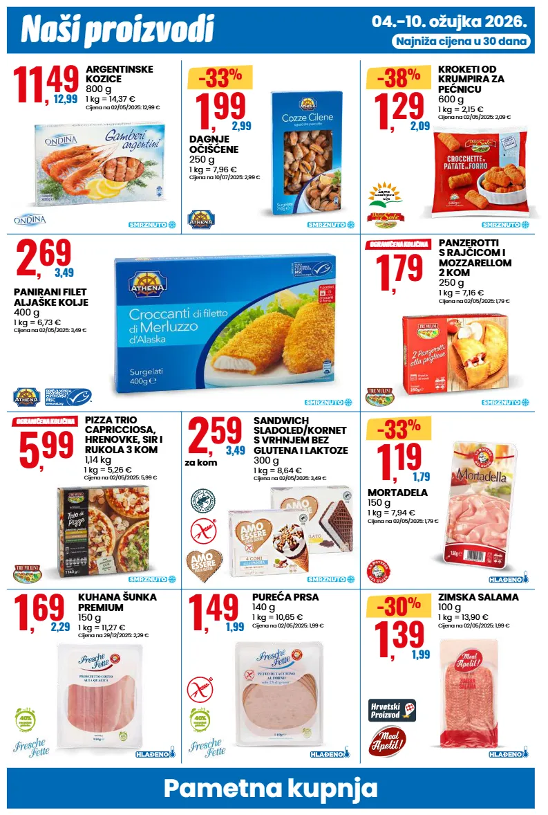 naši proizvodi pametna kupnja 04.-10. ožujka 2026. najniža cijena u 30 dana 11 , 49 12,99 argentinske kozice 800 g 1 kg = 14,37 € cijena na 02/05/2025: 12,99 € 1 , 99 2,99 -33 % dagnje očišćene 250 g 1 kg = 7,96 € cijena na 10/07/2025: 2,99 € 2 , 69 3,49 panirani filet aljaške kolje 400 g 1 kg = 6,73 € cijena na 02/05/2025: 3,49 € 5 , 99 ograničena količina pizza trio capricciosa, hrenovke, sir i rukola 3 kom 1,14 kg 1 kg = 5,26 € cijena na 02/05/2025: 5,99 € 1 , 79 ograničena količina panzerotti s rajčicom i mozzarellom 2 kom 250 g 1 kg = 7,16 € cijena na 02/05/2025: 1,79 € 2 , 59 3,49 za kom sandwich sladoled/kornet s vrhnjem bez glutena i laktoze 300 g 1 kg = 8,64 € cijena na 02/05/2025: 3,49 € 1 , 19 1,79 -33 % mortadela 150 g 1 kg = 7,94 € cijena na 02/05/2025: 1,79 € 1 , 69 2,29 40% recycled plastic kuhana šunka premium 150 g 1 kg = 11,27 € cijena na 29/12/2025: 2,29 € 1 , 49 1,99 40% recycled plastic pureća prsa 140 g 1 kg = 10,65 € cijena na 02/05/2025: 1,99 € 1 , 39 1,99 -30 % zimska salama 100 g 1 kg = 13,90 € cijena na 02/05/2025: 1,99 € 1 , 29 2,09 samo ulje suncokretovo -38 % kroketi od krumpira za pećnicu 600 g 1 kg = 2,15 € cijena na 02/05/2025: 2,09 €