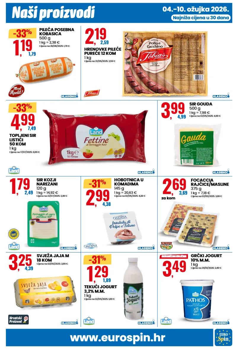 www.eurospin.hr naši proizvodi 04.-10. ožujka 2026. najniža cijena u 30 dana 2 , 19 2,59 hrenovke pileće pureće 12 kom 1 kg cijena na 22/05/2025: 2,59 € 1 , 19 1,79 -33 % pileća posebna kobasica 500 g 1 kg = 2,38 € cijena na 26/08/2025: 1,79 € 4 , 99 7,49 -33 % topljeni sir listići 50 kom 1 kg cijena na 17/07/2025: 6,99 € 3 , 99 4,99 sir gouda 500 g 1 kg = 7,98 € cijena na 02/05/2025: 4,99 € 1 , 79 2,49 • p r o t e c t e d g e o g r a p h i c a l i n d i c a t i o n • sir kozji narezani 120 g 1 kg = 14,92 € cijena na 22/07/2025: 2,49 € 2 , 99 4,38 -31 % hobotnica u komadima 145 g 1 kg = 20,63 € cijena na 02/05/2025: 4,38 € 2 , 69 3,69 za kom focaccia rajčice/masline 375 g 1 kg = 7,18 € cijena na 02/05/2025: 3,69 € 3 , 25 4,39 svježa jaja m 18 kom cijena na 02/05/2025: 3,99 € 1 , 29 1,89 -31 % tekući jogurt 3,2% m.m. 1 kg cijena na 02/05/2025: 1,89 € 3 , 49 ograničena količina grčki jogurt 10% m.m. 1 kg cijena na 29/01/2026: 3,49 €